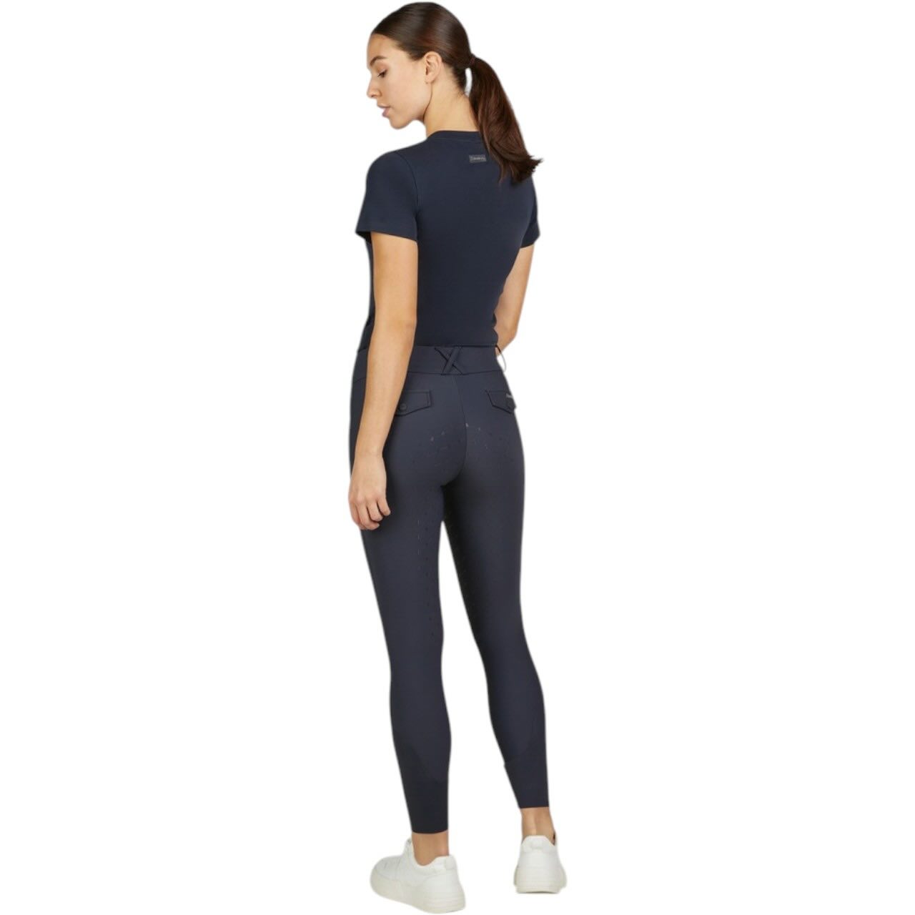 Der leichte, abriebfeste Full-Grip Besatz bietet dir zuverlässigen Halt im Sattel, ohne die Beweglichkeit einzuschränken. Besonders bei feinen Hilfengebungen unterstützt dich die griffige Oberfläche für ein stabiles Sitzgefühl. Gleichzeitig bleibt das Material flexibel und angenehm zu tragen. Der hohe Bund mit Gürtelschlaufen sorgt für eine optimale Passform und sicheren Sitz. Verschlossen wird die Reithose über einen Reißverschluss und hochwertige Knöpfe. Eine dezente Metall-Plakette unterstreicht den sportlich-eleganten Look.