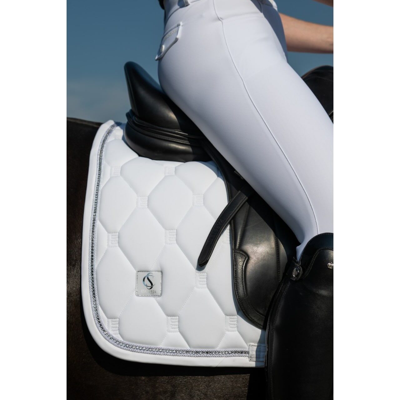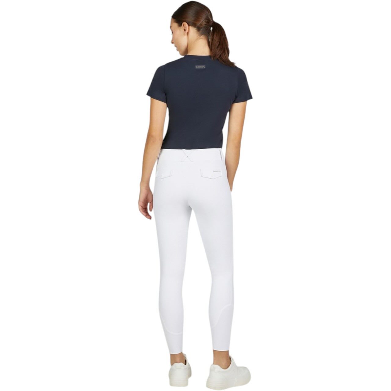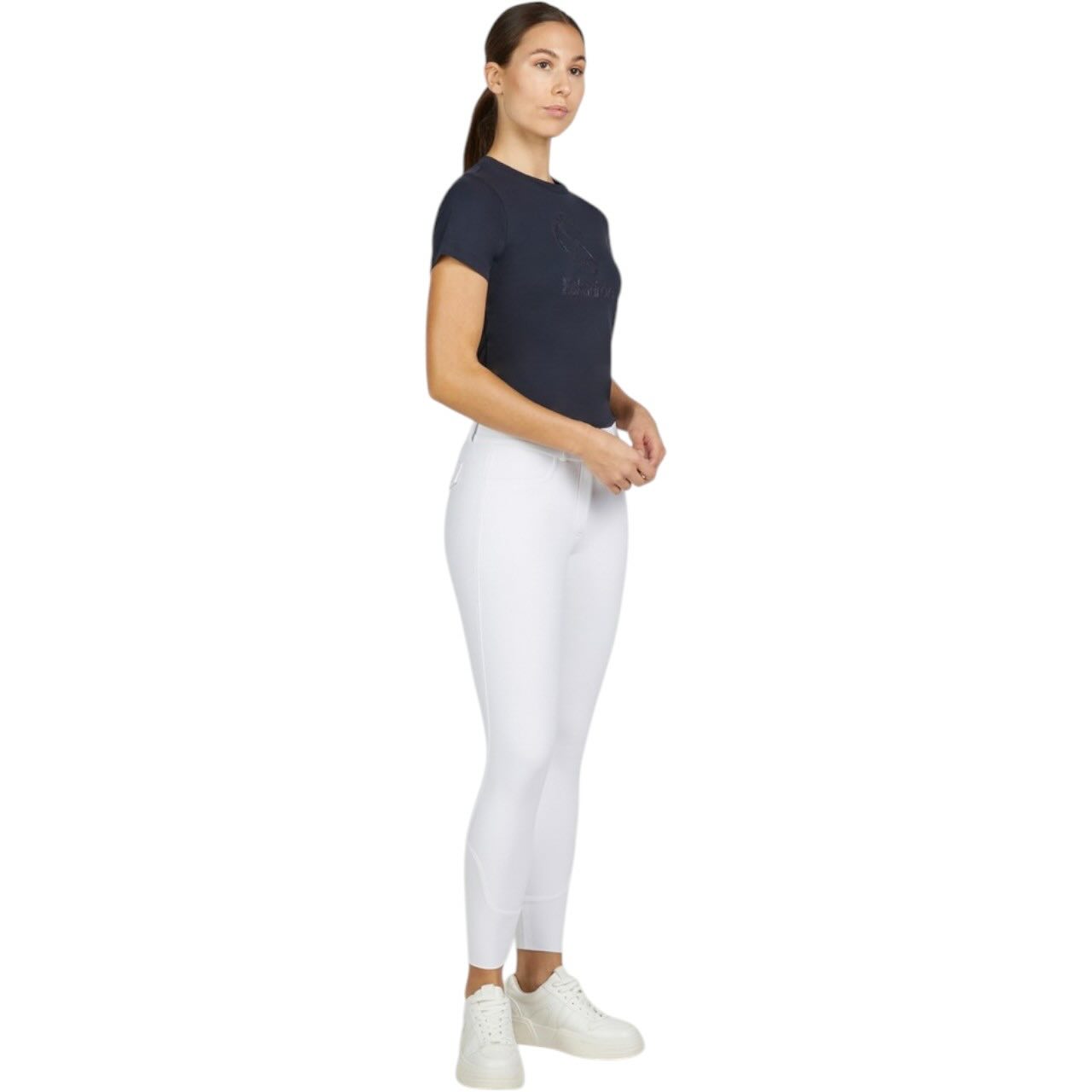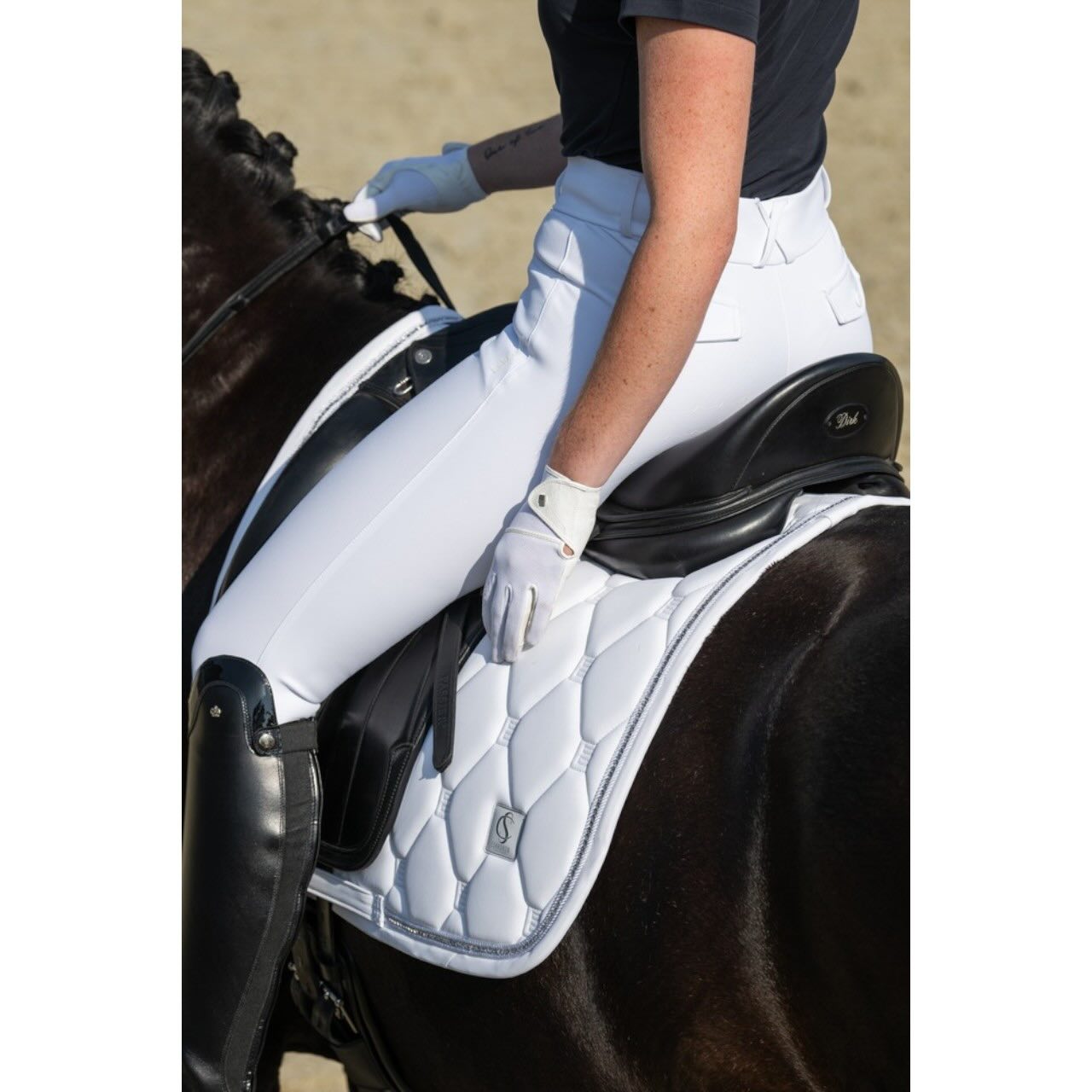 Der leichte, abriebfeste Full-Grip Besatz bietet dir zuverlässigen Halt im Sattel, ohne die Beweglichkeit einzuschränken. Besonders bei feinen Hilfengebungen unterstützt dich die griffige Oberfläche für ein stabiles Sitzgefühl. Gleichzeitig bleibt das Material flexibel und angenehm zu tragen. Der hohe Bund mit Gürtelschlaufen sorgt für eine optimale Passform und sicheren Sitz. Verschlossen wird die Reithose über einen Reißverschluss und hochwertige Knöpfe. Eine dezente Metall-Plakette unterstreicht den sportlich-eleganten Look.