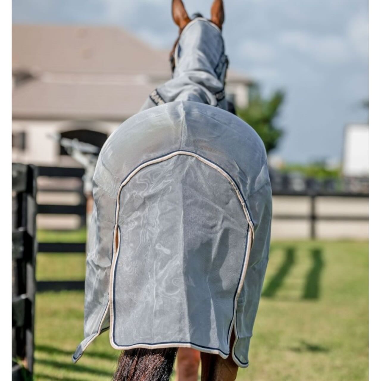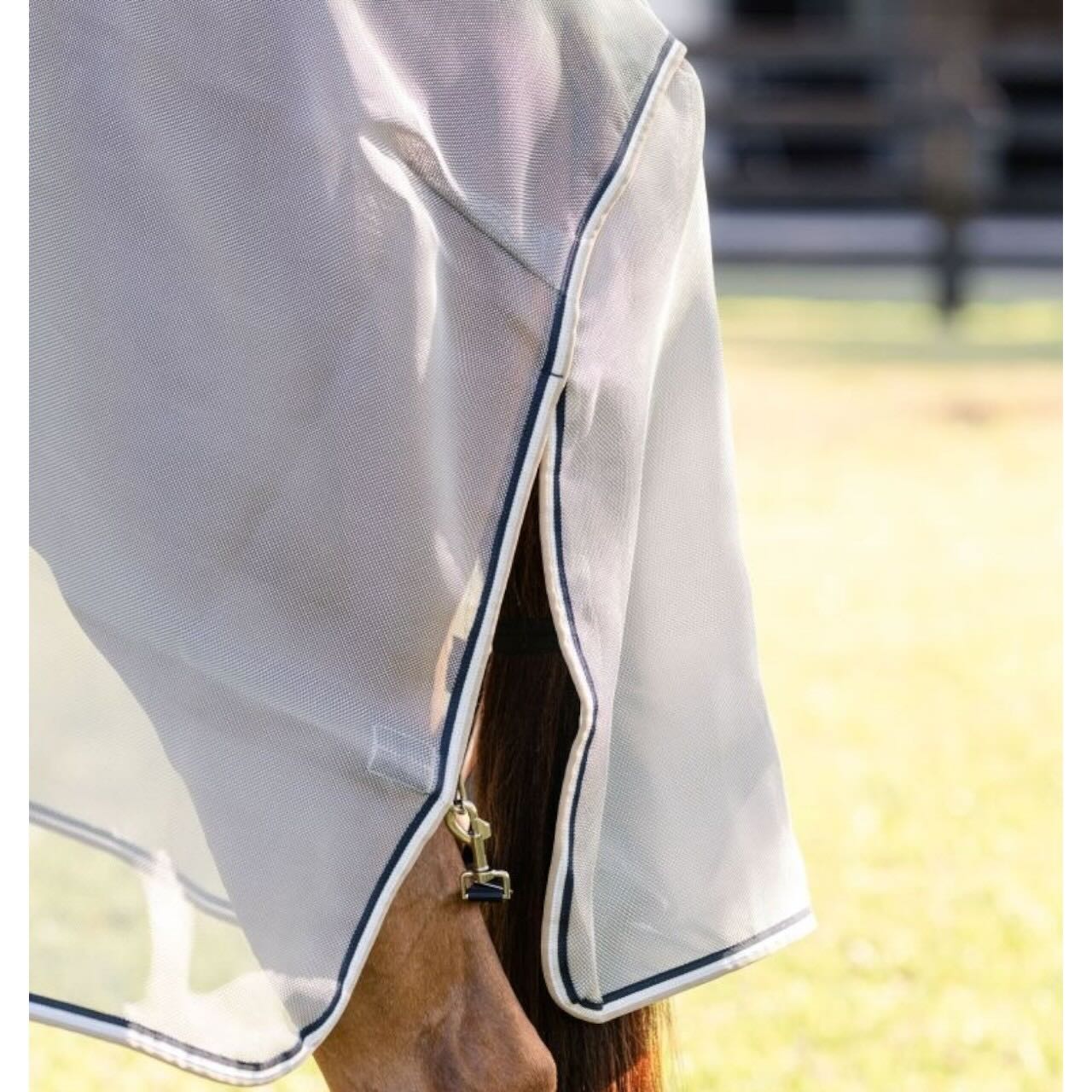 Das patentierte, selbstreparierende Mesh-Gewebe aus Polyester und Nylon ist besonders strapazierfähig und atmungsaktiv. Es bietet deinem Pferd effektiven Schutz vor Fliegen, Bremsen und anderen Insekten. Gleichzeitig sorgt der integrierte 65 % UV-Schutz für eine deutliche Reduzierung schädlicher Sonneneinstrahlung. Der verlängerte Schnitt im Brust-, Karpal- und Sprunggelenksbereich deckt empfindliche Zonen großzügig ab. Ein extra breiter Bauchlatz sowie ein großzügiger Schweiflatz erhöhen die Schutzfläche zusätzlich. So eignet sich die Decke ideal für Pferde mit sensibler Haut oder starkem Bewegungsdrang.