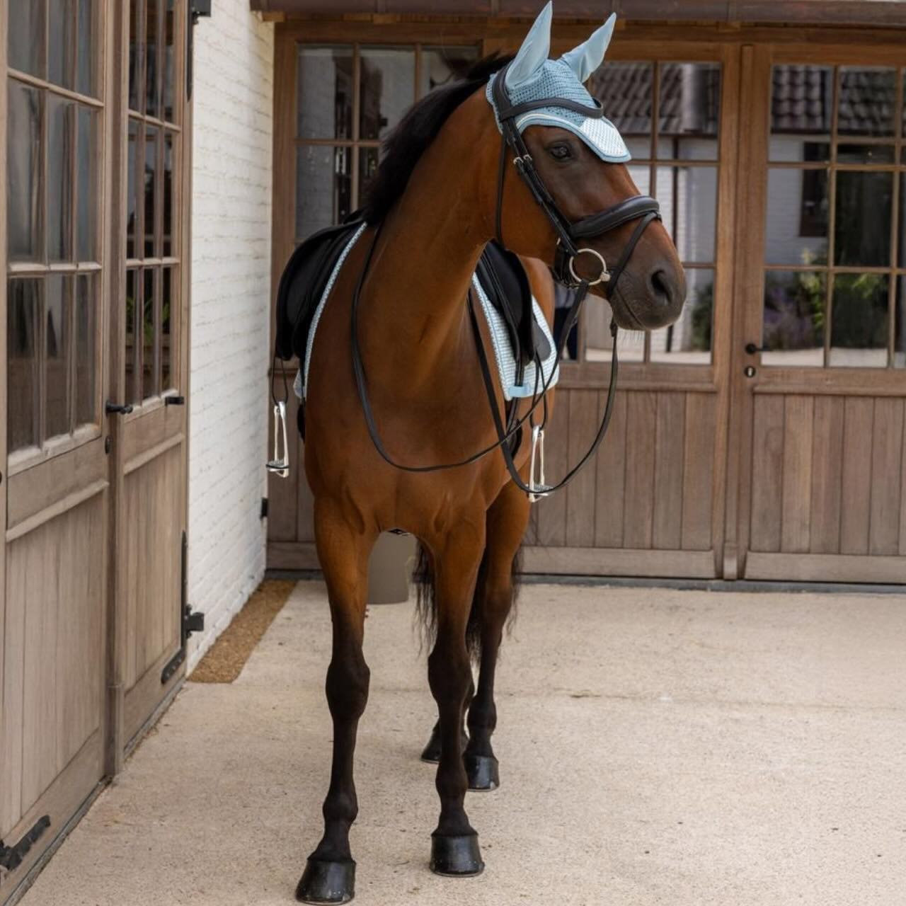 Damit sich dein Pferd jederzeit wohlfühlt, verfügt die Fliegenhaube über dehnbares Material an den Ohren. Dieses bietet einen angenehmen Sitz und vermeidet Druckstellen, auch bei längerem Einsatz. Ein verlängerter Nackenteil sorgt dafür, dass die Haube nicht verrutscht – selbst bei intensiven Trainingseinheiten oder Wettkämpfen. Durch die handgefertigte Verarbeitung bleibt die Form stabil und passt sich zugleich optimal an. Das atmungsaktive Material unterstützt den Komfort deines Pferdes bei allen Disziplinen, ob Dressur, Springen oder Eventing. Gleichzeitig wird ein harmonisches Gesamtbild geschaffen, das sowohl stilvoll als auch funktional überzeugt.