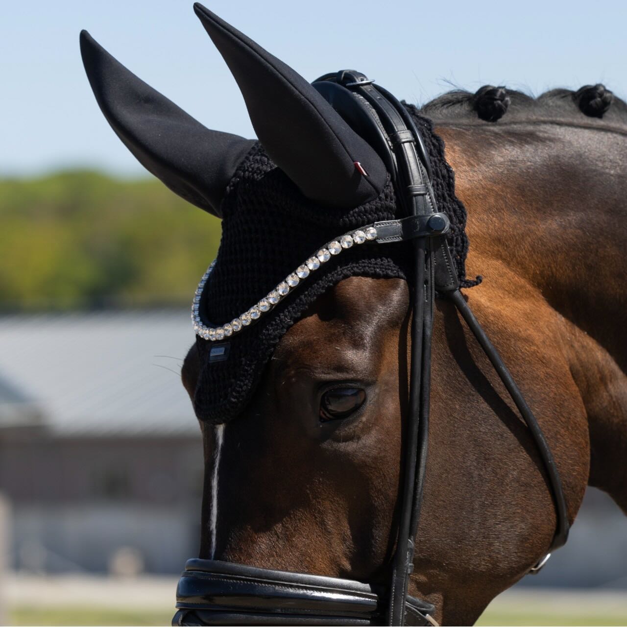Die Ohrenpartie ist mit 100 % Neopren gefüttert und unterstützt eine effektive Geräuschdämmung. Dadurch werden Umgebungsgeräusche auf dem Abreiteplatz oder in der Prüfung spürbar reduziert. Dein Pferd kann sich besser konzentrieren und bleibt auch in belebter Umgebung ruhiger. Das äußere Ohrmaterial besteht aus einem weichen, elastischen Stoff mit Nylon- und Elasthan-Anteil. Diese Materialkombination sorgt für eine angenehme Passform ohne Druckstellen. Gleichzeitig bleibt die Bewegungsfreiheit der Ohren vollständig erhalten.
