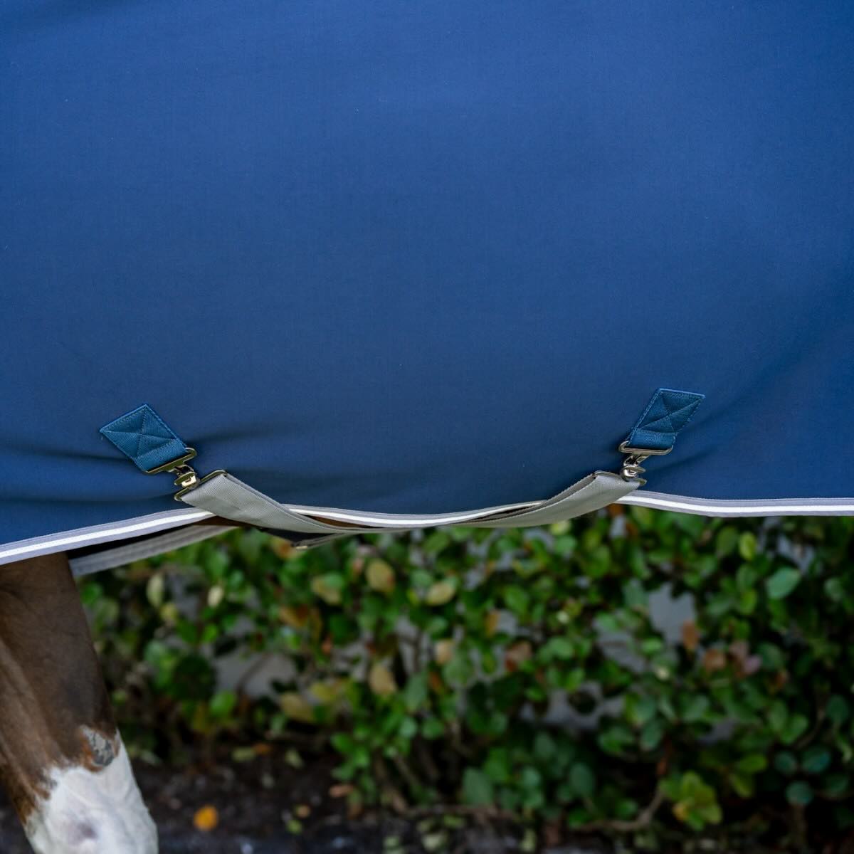 Der klassische Schnitt bietet eine optimale Passform für viele Pferdetypen. Ein einfacher Brustverschluss erleichtert das Anlegen der Decke. Zwei abnehmbare Kreuzgurte sorgen für sicheren Halt. Die Schweifkordel verhindert ein Verrutschen. Auch bei Bewegung bleibt die Decke zuverlässig an Ort und Stelle. Das Ergebnis ist ein eng anliegender, komfortabler Sitz.