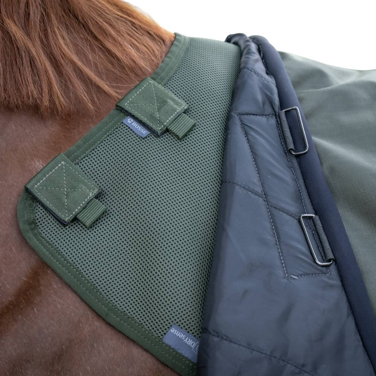 Die Busse Bewegungsdecke Rain 100g ist die perfekte Wahl für das Training in Führanlage oder auf dem Laufband bei kühlen und nassen Wetterbedingungen. Mit ihrem schulterfreien Design garantiert sie Bewegungsfreiheit und schützt dein Pferd zuverlässig vor Wind, Regen und Kälte.