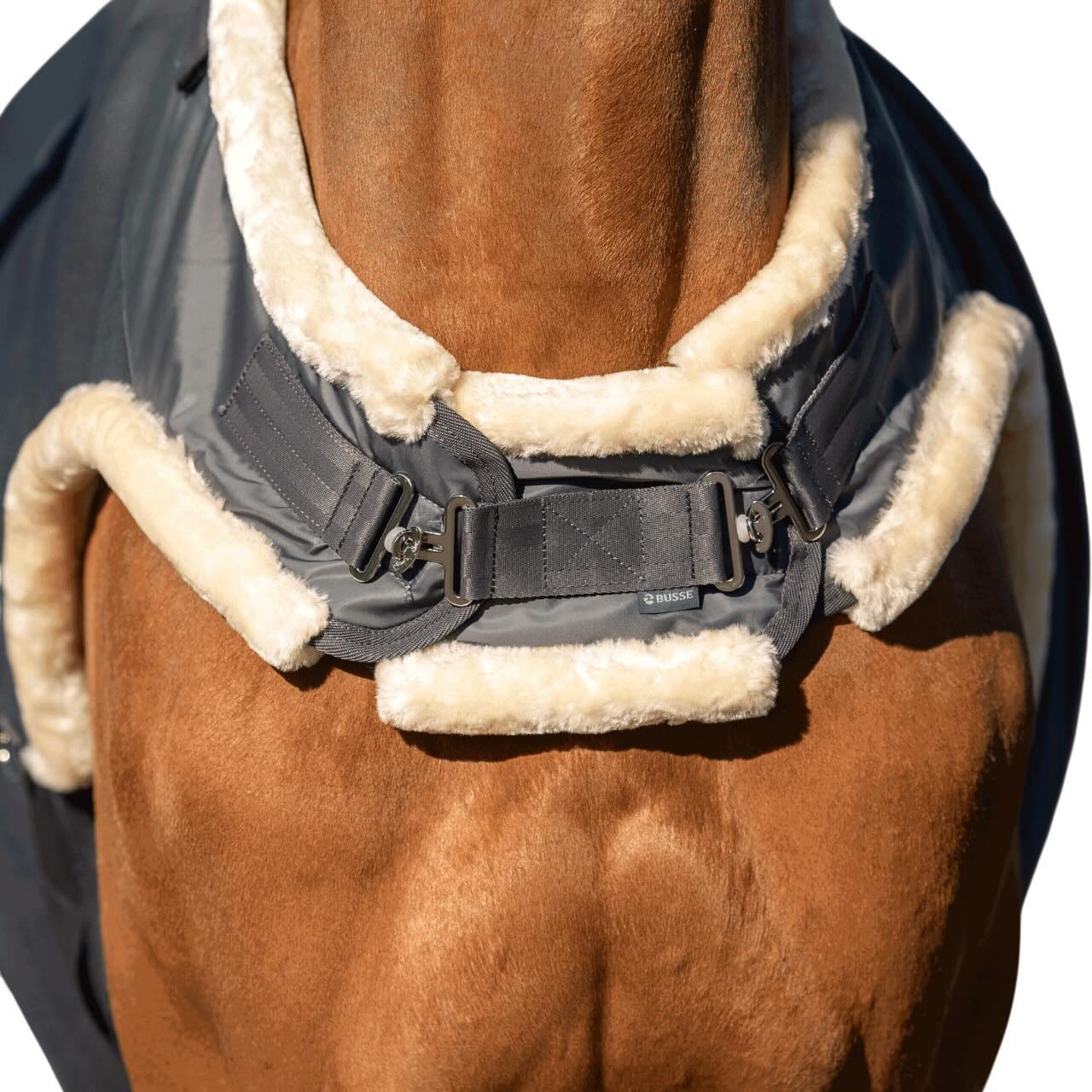Die BUSSE Brusterweiterung für Bewegungsdecke 3D Air wurde speziell entwickelt, um die Passform der Bewegungsdecken individuell anzupassen. Sie schafft zusätzliche Weite im Brustbereich, ohne den Sitz der Decke im restlichen Bereich zu beeinträchtigen. Das weiche Kunstfell schmiegt sich angenehm an und schützt vor Reibung. Durch die atmungsaktiven Materialien bleibt die Luftzirkulation unter der Decke gewährleistet. So profitieren Pferde von optimalem Komfort – auch bei längerer Tragezeit.