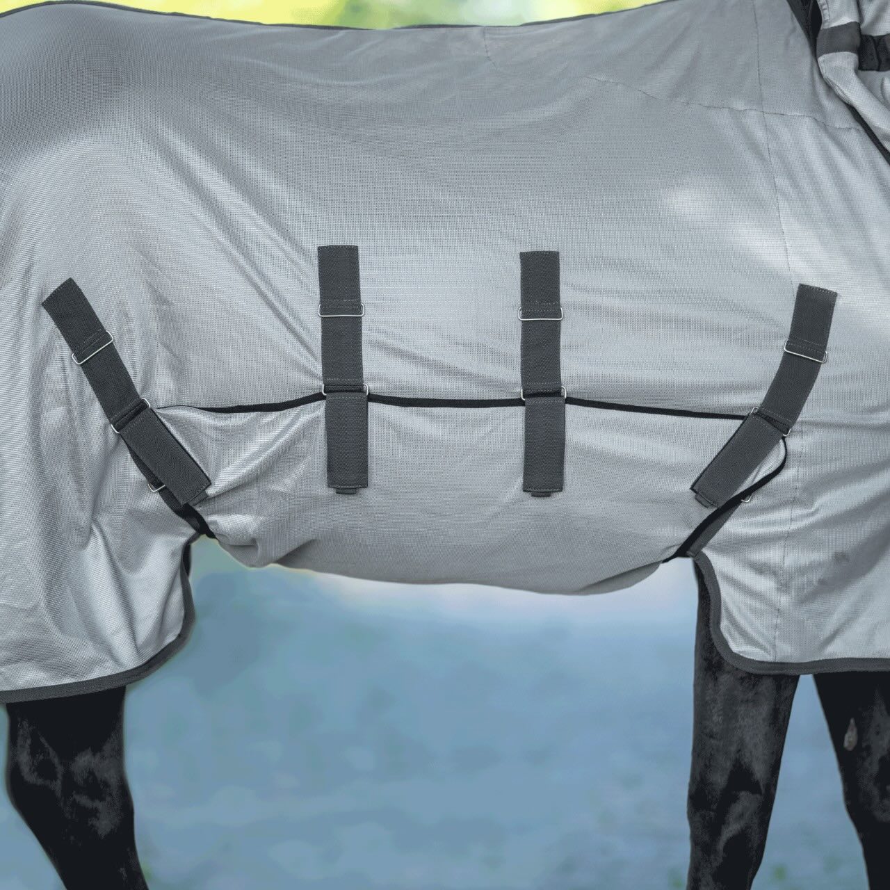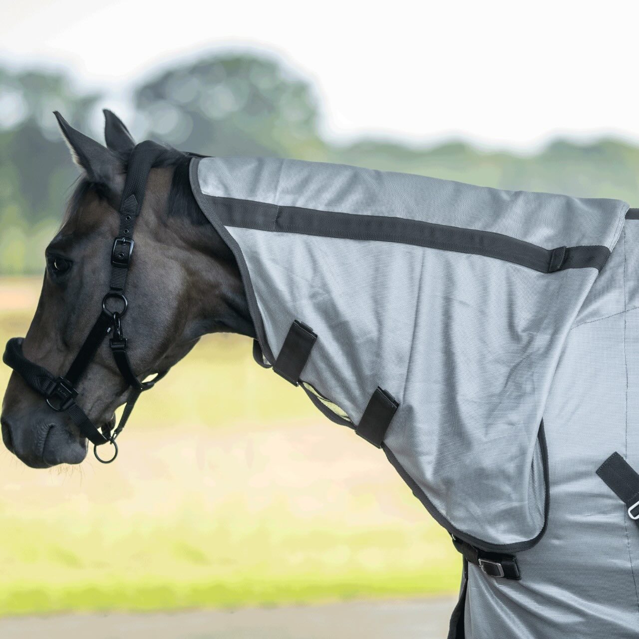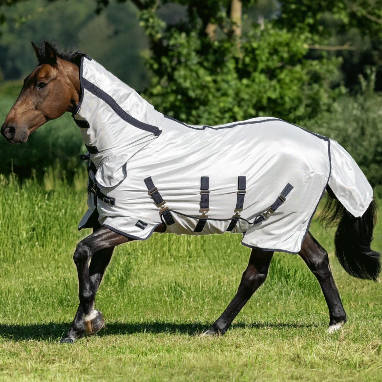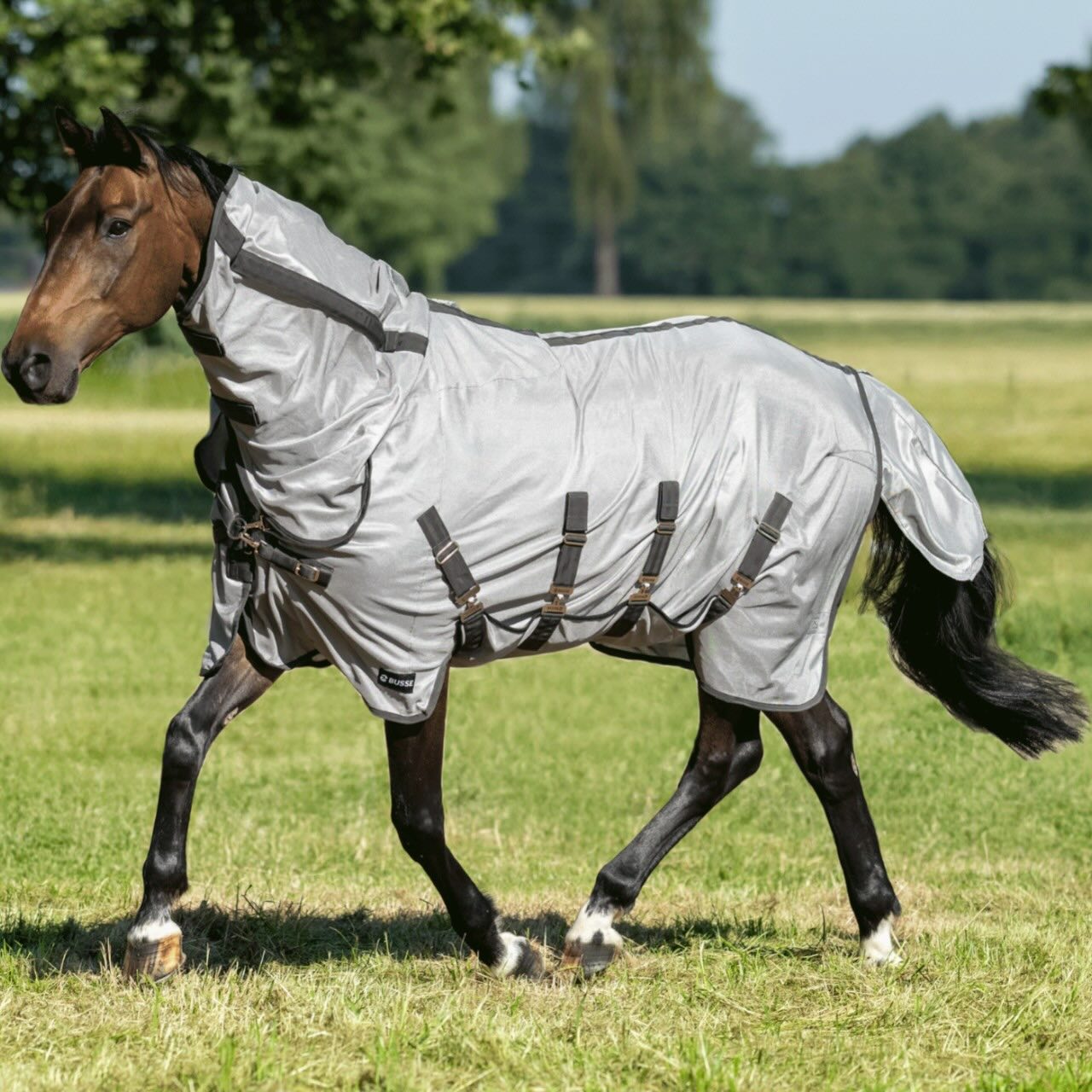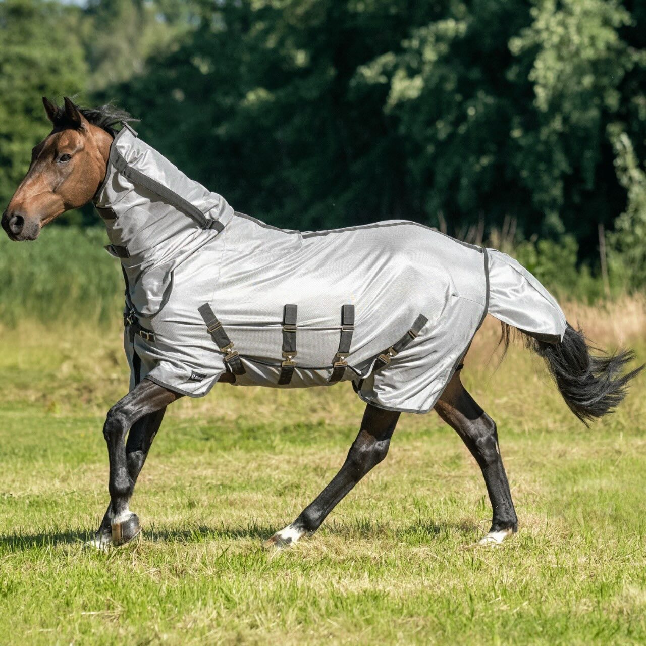Das extra strapazierfähige Spezialgewebe aus 100 % Polyester schützt dein Pferd zuverlässig vor Fliegen, Bremsen und anderen Insekten. Die fein gewebte Struktur ist besonders widerstandsfähig und zugleich atmungsaktiv sowie schnelltrocknend. Im Mähnen-, Brust- und Widerristbereich sorgt ein glattes Polyester-Satinlining für angenehmen Tragekomfort. Das fest integrierte Halsteil bietet zusätzlichen Schutz für empfindliche Partien. Eine herausnehmbare Verstärkung entlang des oberen Halses verhindert effektiv das Herunterrutschen bei aufrechter Kopfhaltung. So bleibt die Decke auch bei Bewegung und beim Grasen sicher in Position.