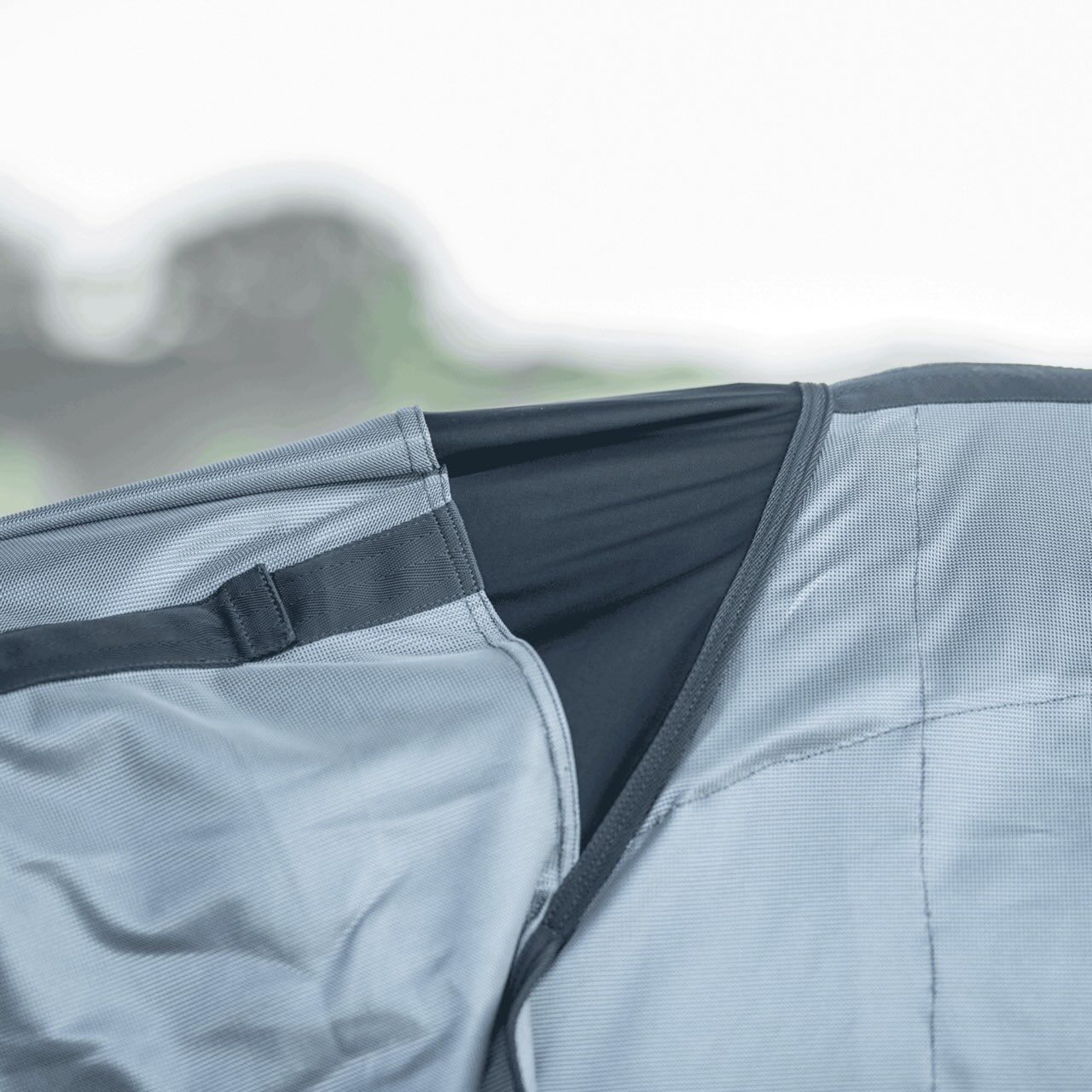 V-Quick-Snap-Brustschnallen mit integriertem Doppelklett und auswechselbaren Karabinern ermöglichen ein sicheres und schnelles Anlegen. Ein spezieller Strap am Brustverschluss verhindert das Einklappen der Decke nach innen. Die anatomische Schweifabdeckung schützt die Hinterhand zuverlässig vor Insekten. Eine tiefe Hinterhandkordel sorgt für zusätzlichen Halt bei Wind und Bewegung. Besonders praktisch ist die innenliegende Einschubtasche am Widerrist. Hier kannst du das separat erhältliche Widerristpolster 3D AIR EFFECT (Art.-Nr. 603361) für noch mehr Komfort integrieren.