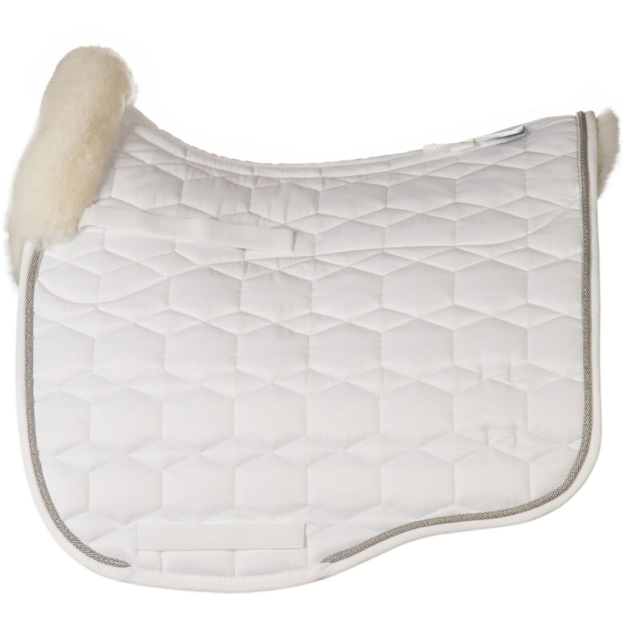 Die Mattes Dressurschabracke Eurofit Weiß mit Aluminium Kordel verbindet klassischen Stil mit durchdachter Funktionalität. In edlem Weiß gehalten und mit einer Aluminium-Kordel verziert, bietet sie dank Lammfellrand vorne optimalen Komfort – ideal für Dressurtraining und Turniereinsätze.
