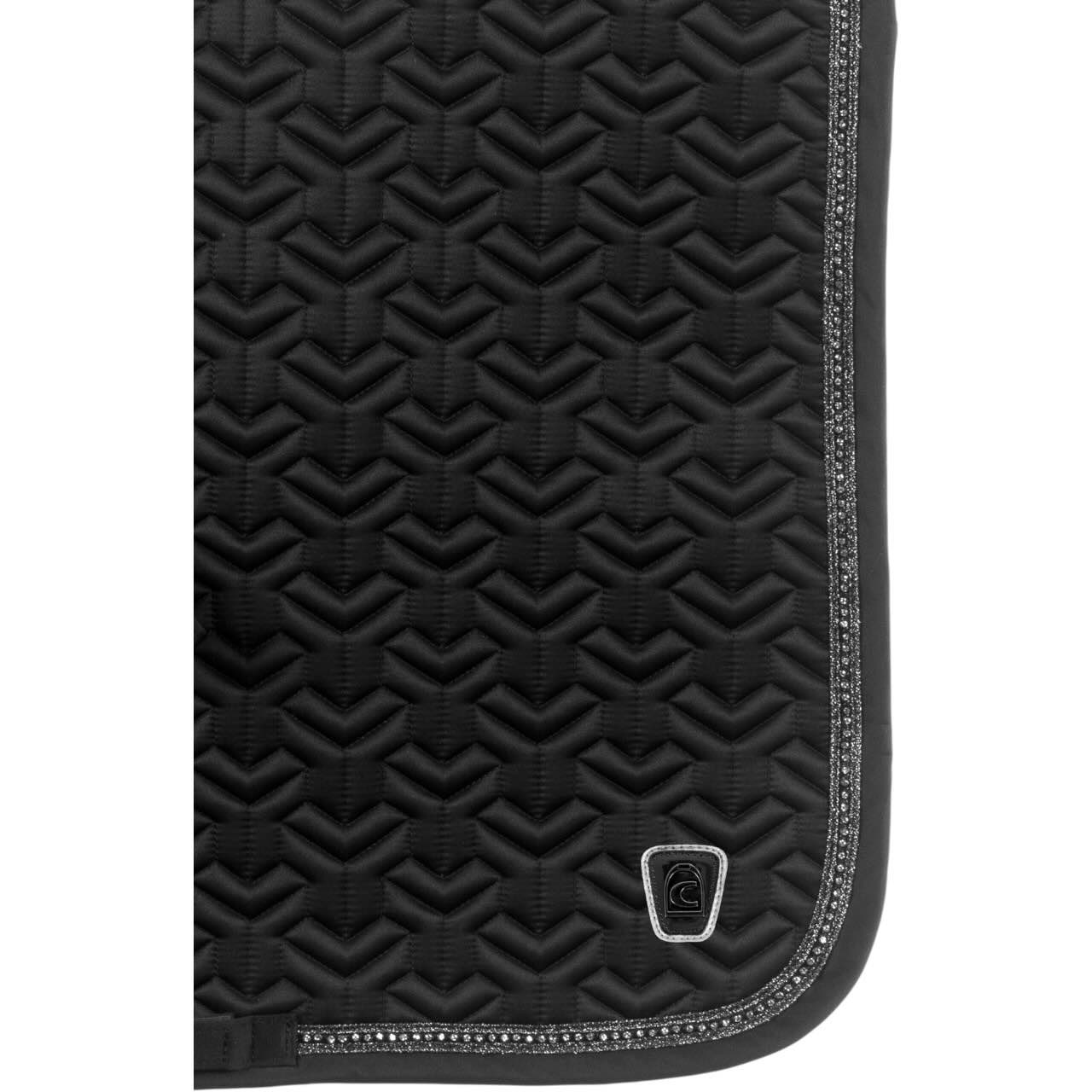 Die aufwendige Steppung in grafischer Optik verleiht der Schabracke eine moderne Struktur. Glänzendes Obermaterial unterstreicht den eleganten Gesamteindruck und sorgt für einen hochwertigen Look im Dressursattel. Zwischen den beiden Einfassbändern zieht ein funkelndes Kristallband die Blicke auf sich – dezent, aber wirkungsvoll. Dieses exklusive Detail rahmt die Schabracke stilvoll ein und macht sie zu einem echten Hingucker. Abgerundet wird das Design durch zwei Cavallo-Logo-Patches in edler Gunmetal-Optik an den hinteren Ecken. So wird klassische Eleganz mit einem Hauch Glamour kombiniert.