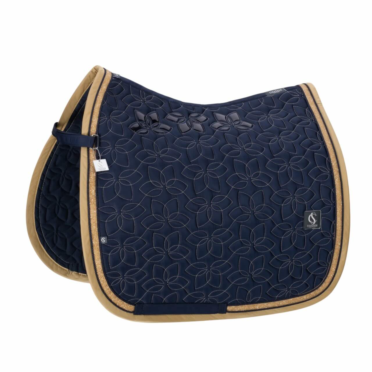 Optisch überzeugt die Schabracke mit einer „Kordel-Jewel-Kordel“ Kombination auf der edlen Glossy-Einfassung. Das beidseitige Emblem sowie das Flag Label unterstreichen den typischen Classic Sports Charakter von Eskadron. Der harmonische Kontrast zwischen Steppung und Einfassung setzt stilvolle Akzente im täglichen Training. Der mitgelieferte Eskadron Anhänger rundet das hochwertige Gesamtbild ab. Durch die Kombination aus Funktion und Design eignet sich das Modell ideal für anspruchsvolle Dressurreiter. So setzt du auf Qualität, Komfort und eine sportlich-elegante Ausstrahlung.