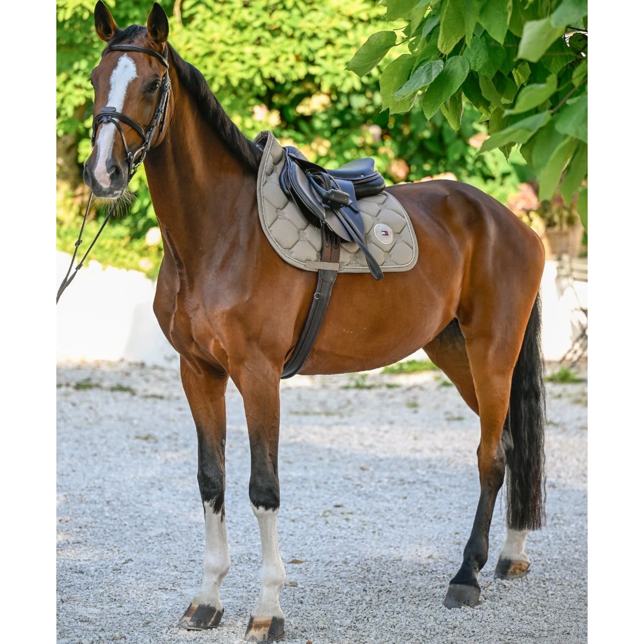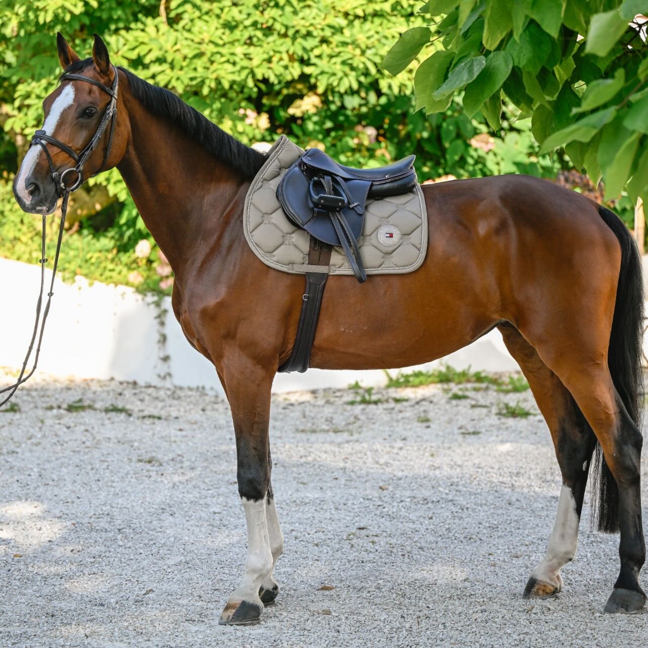 Diese Springschabracke überzeugt durch ihre exklusive Optik mit TH-Monogramm-Rautensteppung. Der Strassstein-Grafikaufnäher auf beiden Seiten setzt funkelnde Akzente und macht die Schabracke zu einem echten Blickfang. Mit der hochwertigen Verarbeitung repräsentiert die Schabracke den typischen Tommy-Hilfiger-Stil. Besonders Reiterinnen und Reiter mit Sinn für Mode werden dieses Modell lieben. Die Kombination aus zeitloser Eleganz und sportlichem Chic macht sie vielseitig einsetzbar. So passt sie perfekt zu jedem Outfit, vom Turnier bis zum Training.
