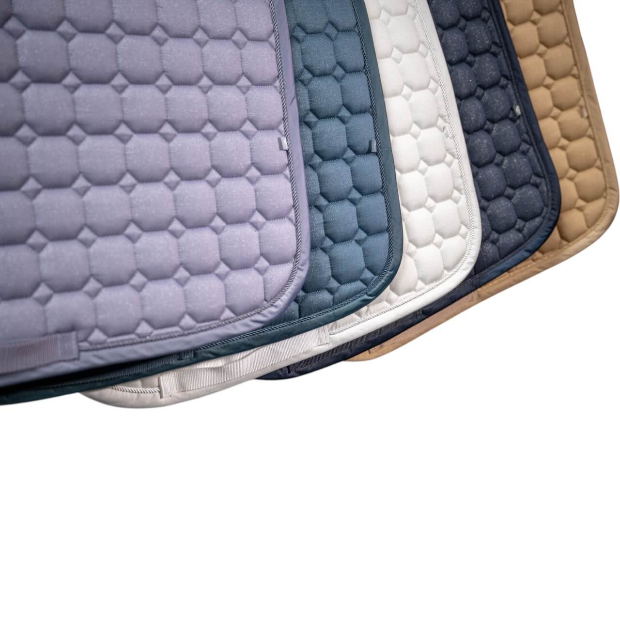 Das glitzernde Baumwoll-Obermaterial sorgt für eine edle Optik und bleibt dabei angenehm strapazierfähig im täglichen Einsatz. Die hautfreundliche Molton-Unterseite unterstützt ein gutes Feuchtigkeitsmanagement und trägt zu einem ausgeglichenen Klima unter dem Sattel bei. Durch die kompakte Füllung mit gleichmäßiger Steppung liegt die Schabracke formstabil am Pferderücken. Druckspitzen können so reduziert und die Druckverteilung verbessert werden. Besonders im Springsport bietet dir die Sattelunterlage zuverlässige Unterstützung bei intensiven Trainingseinheiten. Die hochwertige Verarbeitung steht dabei für die bewährte Eskadron Qualität.