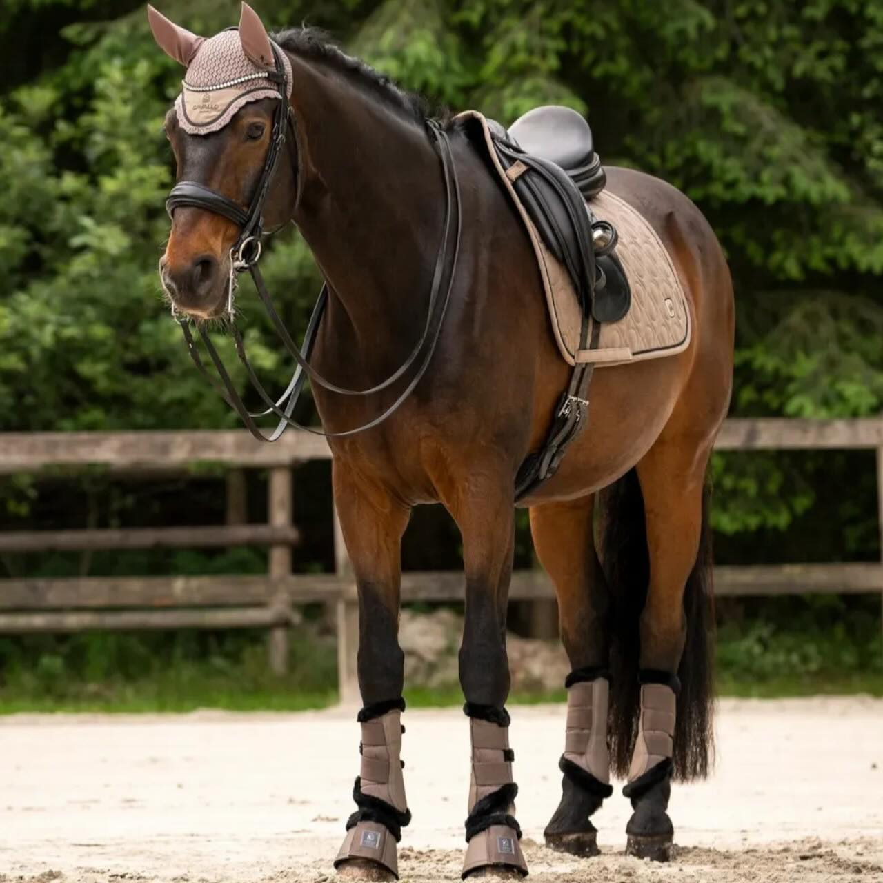 Die Cavallo Springschabracke CAVALPOLLY FS 2026 Sattelunterlage überzeugt mit einem besonders femininen Design. Das edle Lurex-Tape in Kombination mit goldfarbenen Details verleiht der Schabracke eine stilvolle Optik. Die samtig-weiche, pfirsichähnliche Oberfläche sorgt zusätzlich für einen hochwertigen Eindruck. Ein echter Blickfang sind die neuen Cavallo-Logo-Patches an den hinteren Ecken. Eine dezente Stickerei entlang des Rückenkanals rundet das Design harmonisch ab. So entsteht eine Schabracke, die sportliche Funktion mit moderner Reitsport-Ästhetik verbindet.