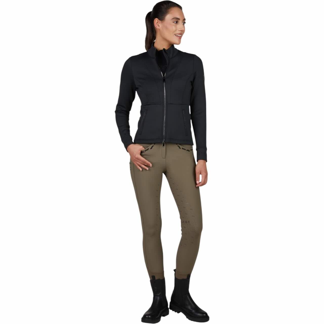 Der praktische 2-Wege-Kantenreißverschluss ermöglicht dir ein flexibles Öffnen und Schließen – ideal, wenn du dich beim Reiten oder in Bewegung schnell anpassen möchtest. Die schmalen Leistentaschen sind mit verdeckten Reißverschlüssen ausgestattet, sodass deine Essentials sicher verstaut bleiben. Dezente Crystalpearls auf den Leistentaschen und an den Ärmelbündchen setzen elegante Highlights. Der PIKEUR-Schriftzug verleiht der Jacke zusätzlich einen hochwertigen Markencharakter. Durch die gelungene Kombination aus Funktionalität und Style ist sie ein echtes Must-have für jede Reiterin. Dank ihres zeitlosen Designs passt sie zu vielen Outfits.