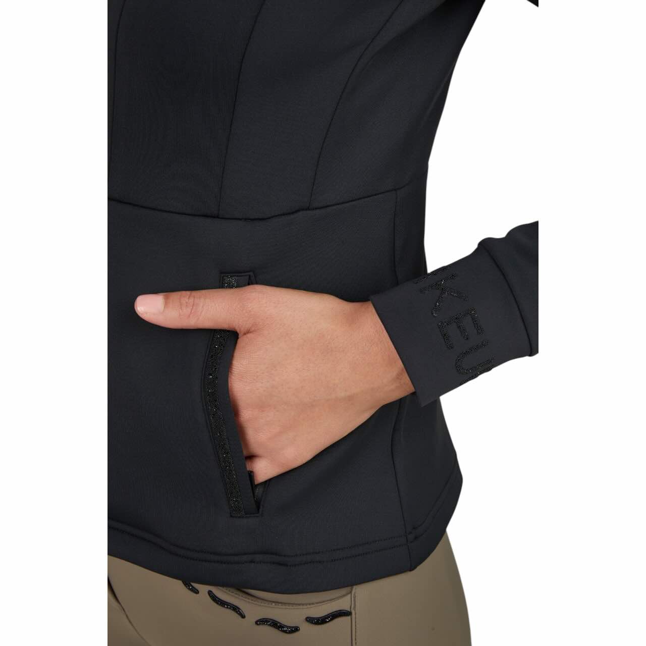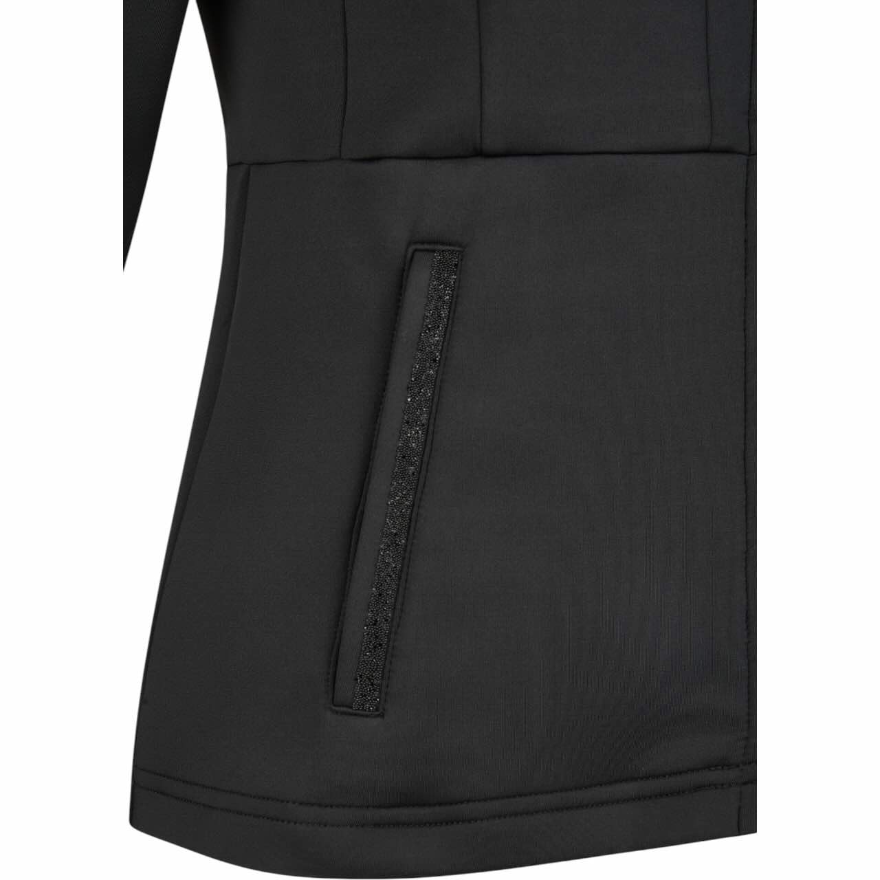 Besonderheiten 2-Wege Kantenreißverschluss, Crystalpearls auf den Leistentaschen und an den Ärmelbündchen als Pikeur-Schriftzug, schmale Leistentaschen mit verdeckten Reißverschlüssen