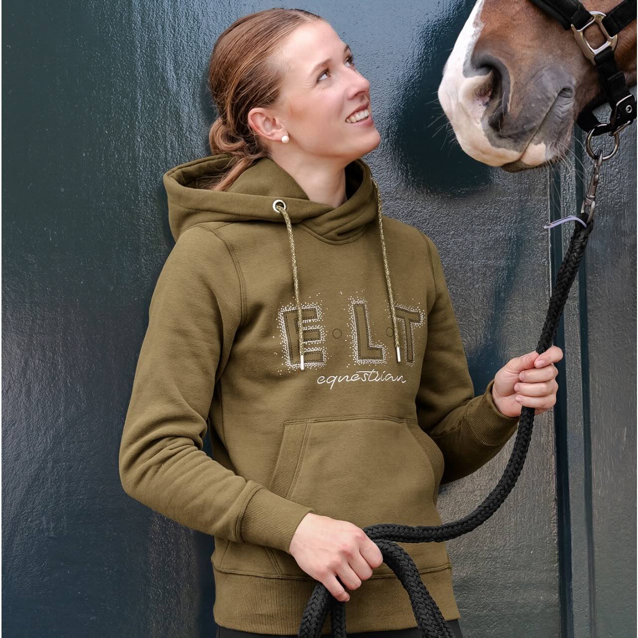 Die Kapuze des E.L.T  Hoodie Damen Rio Kapuzenpullover ist mit einem Tunnelzug und einer dekorativen Kordel ausgestattet, sodass du sie individuell anpassen kannst. Das Highlight ist das elegante E.L.T Equestrian Stick-Logo auf der Vorderseite, das mit funkelnden Strasssteinchen veredelt wurde – ein echter Blickfang, der deinem Outfit einen Hauch von Glamour verleiht. Durch das durchdachte Design fügt sich der Hoodie harmonisch in jede Reitsport-Garderobe ein. Ob kombiniert mit einer Reithose, Jeans oder Steppweste – der Rio Pullover sorgt stets für einen modischen Auftritt. Dabei bleibt er pflegeleicht und robust, selbst bei regelmäßigem Gebrauch.