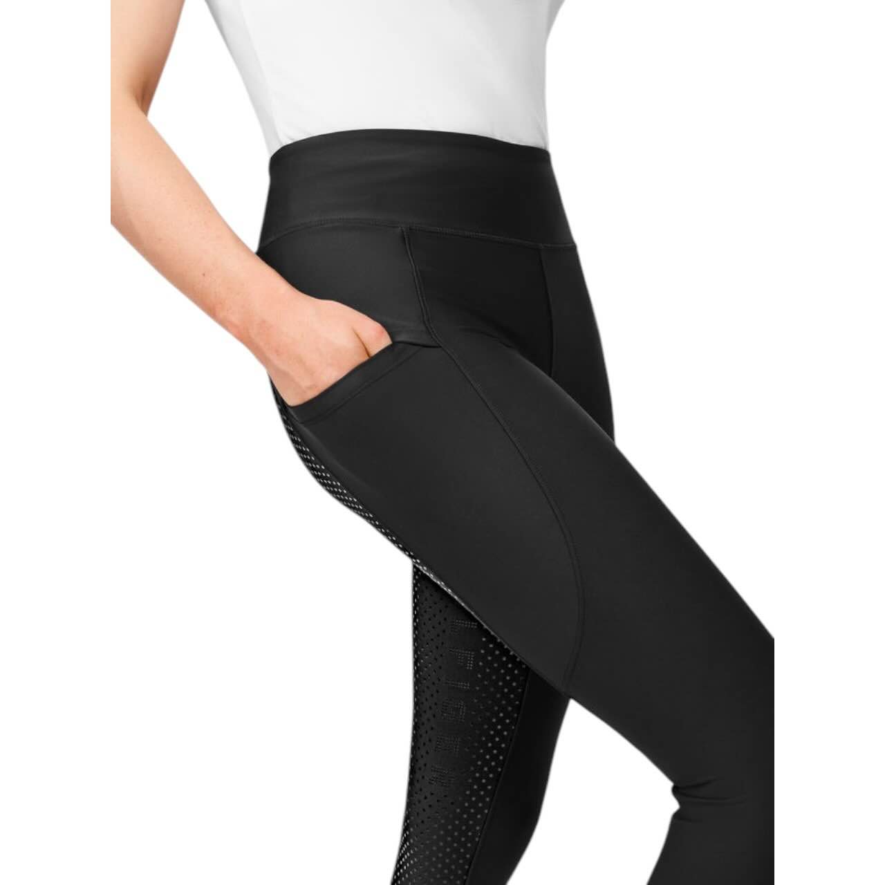 Der hochwertige Silikon-Vollbesatz sorgt für einen stabilen Sitz im Sattel und unterstützt eine ruhige Beinlage. Dadurch erhältst du mehr Kontrolle und Sicherheit bei Dressurarbeit, Springtraining oder im Gelände. Die Gripstruktur bietet zuverlässigen Halt, ohne die Bewegungsfreiheit einzuschränken. Gleichzeitig bleibt das Material angenehm flexibel und komfortabel auf der Haut. Auch bei längeren Reiteinheiten bleibt die Leggings formstabil und bequem. Diese Kombination aus Funktion und Komfort macht sie zu einer vielseitigen Wahl für ambitionierte Reiterinnen.