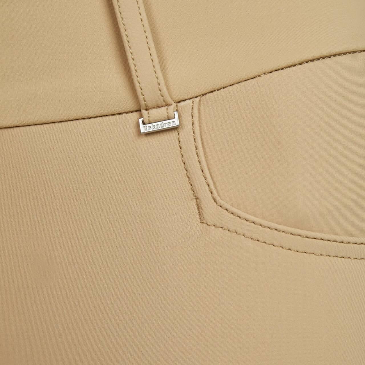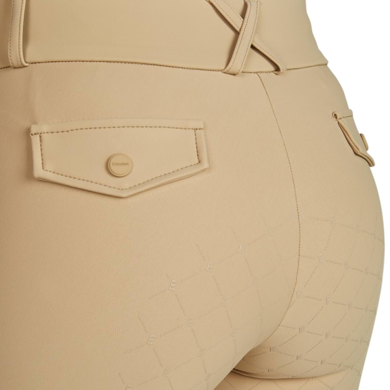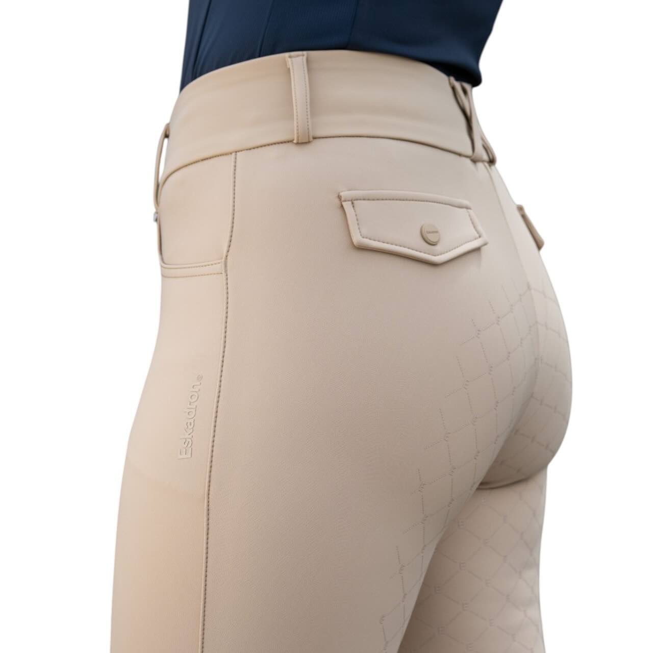 Der formgebende breite Bund mit Gürtelschlaufen sorgt für einen sicheren und komfortablen Sitz. Reißverschluss und Knöpfe ermöglichen ein einfaches An- und Ausziehen der Reithose. Elastische Beinabschlüsse verhindern Druckstellen unter Reitstiefeln oder Chaps. Die Gesäß Fake-Pattentaschen verleihen der Hose einen modernen, sportlichen Look. Ein beidseitiger Eskadron Print rundet das Design markentypisch ab. So kombiniert die Reithose Funktionalität mit einem stilvollen Auftritt im Stall und auf dem Turnier.