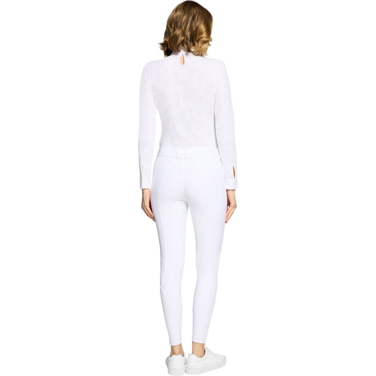 Die Reithose überzeugt durch eine besonders hohe Taille im Rückenbereich, die durch einen V-förmigen Schnitt und kontrastierende Nähte betont wird. Diese Schnittführung unterstützt eine stabile Haltung im Sattel und sorgt gleichzeitig für eine feminine Silhouette. Der Full-Grip Besatz bietet zuverlässigen Halt und fördert eine ruhige Beinlage beim Reiten. Dadurch unterstützt die Hose eine präzise Hilfengebung im Training oder im Parcours. Die ergonomische Passform sorgt für angenehmen Sitz ohne Druckstellen. Gleichzeitig bleibt die Bewegungsfreiheit bei jeder Reitdisziplin erhalten.