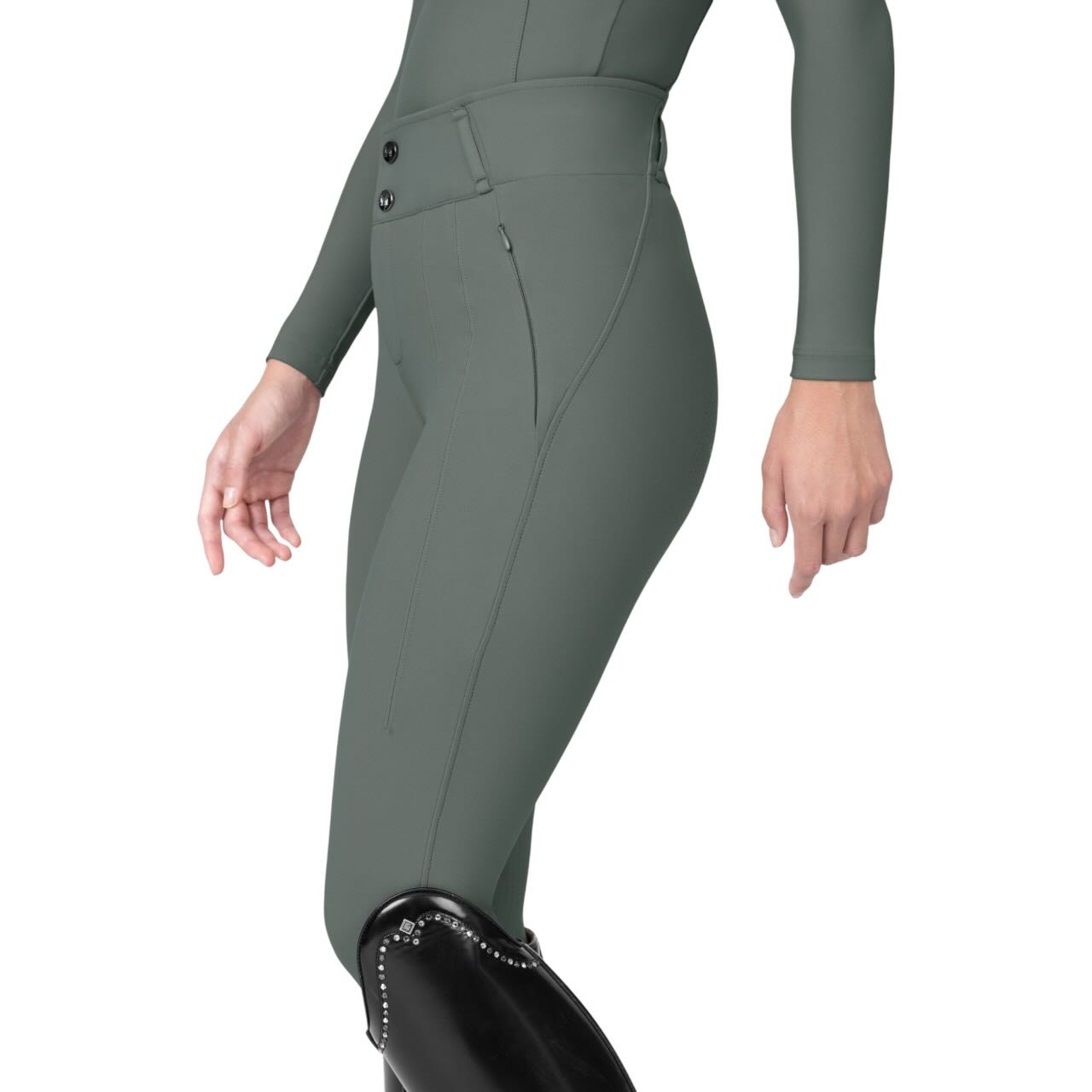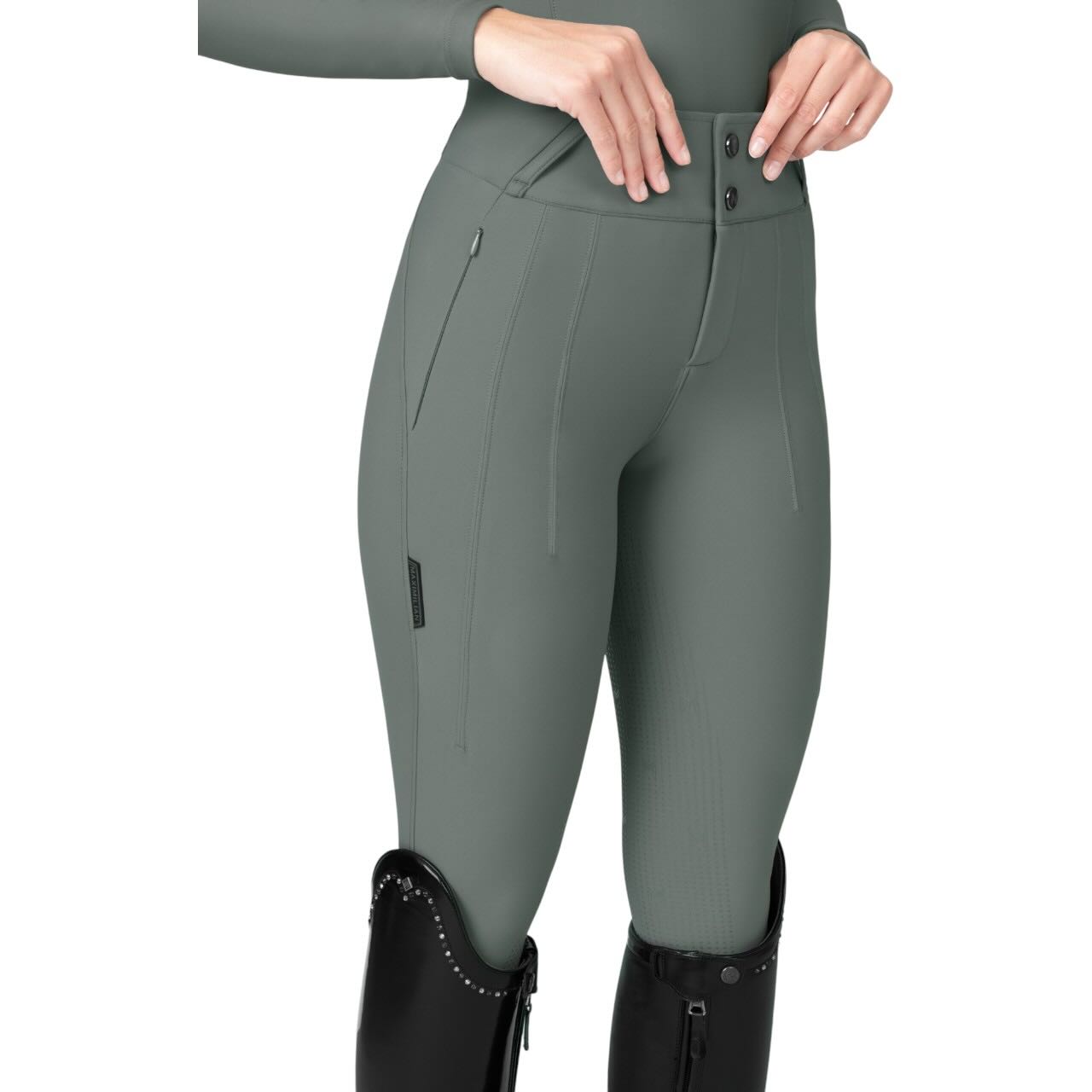 Diese Reithose passt sich jeder Bewegung an und unterstützt dich optimal im Sattel. Dank des ergonomischen Schnitts erlebst du volle Flexibilität ohne Kompromisse bei der Stabilität. Die elegant platzierten Abnäher sorgen für eine feminine Silhouette und einen modernen Look. Die hohe Taille mit breitem Bund bietet dir ganztägigen Tragekomfort. Zwei großzügige, unsichtbar eingearbeitete Reißverschlusstaschen sichern dein Smartphone oder kleine Essentials. Durch den Verzicht auf Nähte an den Innenseiten gibt es keine Druckstellen im Kontaktbereich zum Sattel.