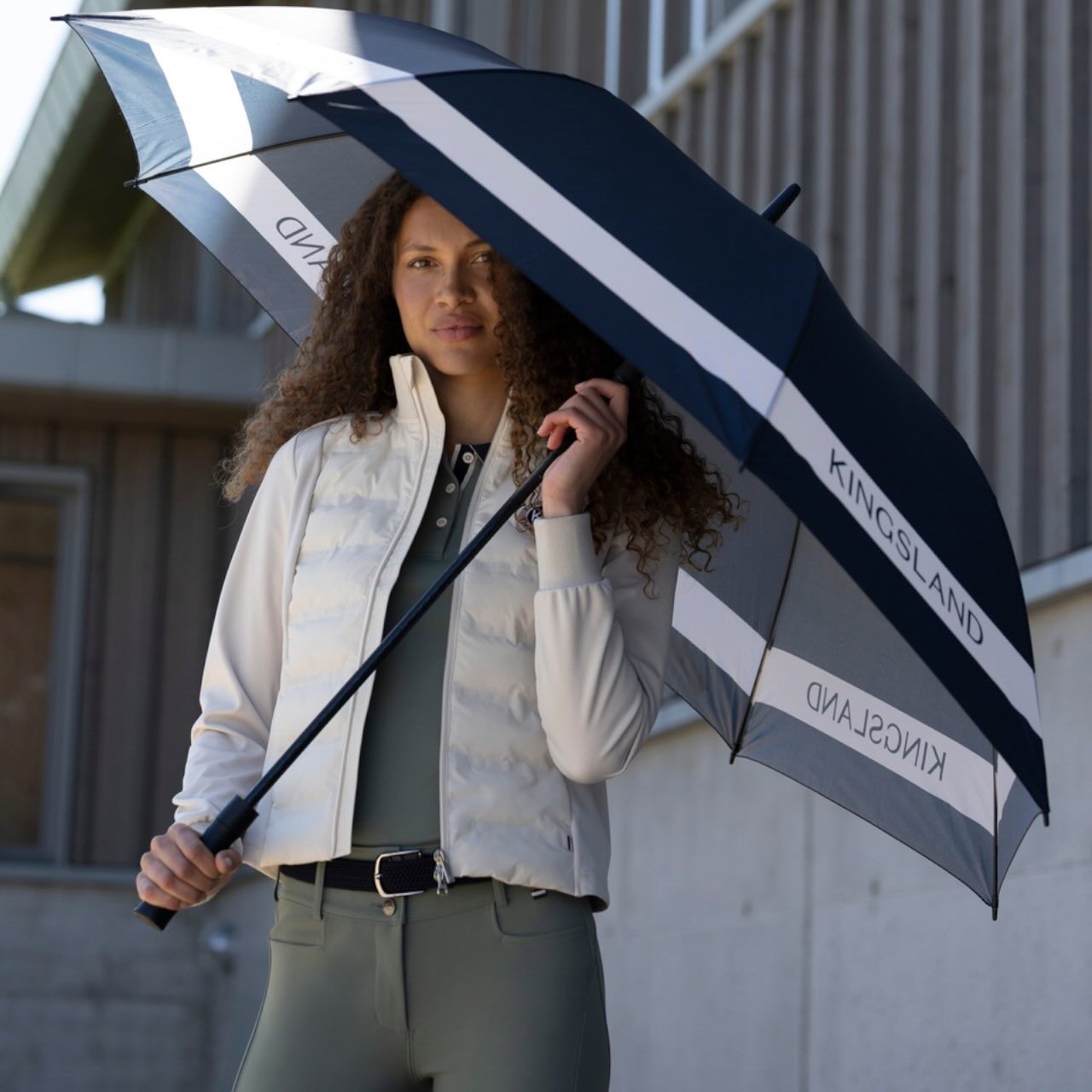 Die marineblaue Bespannung mit kontrastierendem Streifen wirkt klassisch und zugleich modern. Ein dezenter Kingsland-Logo-Print unterstreicht den hochwertigen Markencharakter. Der Regenschirm ergänzt dein Reitoutfit ebenso stilvoll wie deine Freizeitbekleidung. Ob auf dem Reitturnier, beim Spaziergang mit dem Pferd oder im täglichen Gebrauch – er ist vielseitig einsetzbar. Das zeitlose Design passt zu verschiedenen Reitsport-Looks. So erhältst du einen funktionalen und zugleich repräsentativen Begleiter für jede Wetterlage.