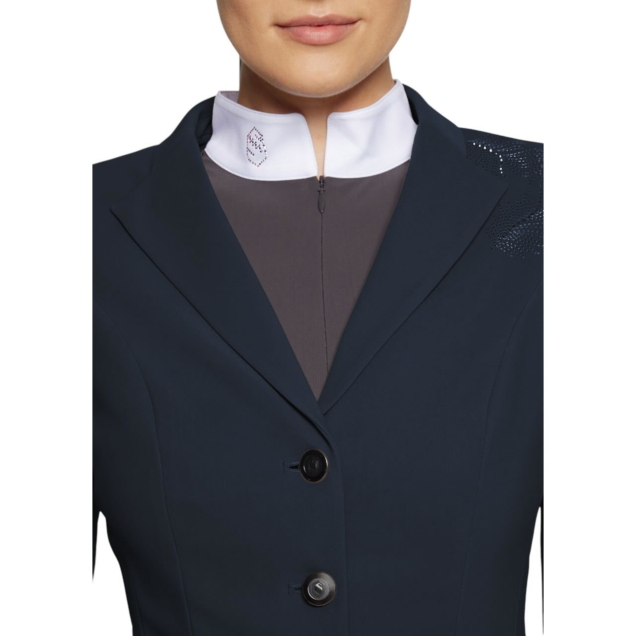 Die feinen Ferna-Blumenstickereien verleihen dem Jacket eine besondere Raffinesse. Dezente Swarovski®-Kristalle an Schulter und Manschette setzen elegante Lichtakzente. Auch das Samshield-Blazon mit Swarovski®-Kristallen unterstreicht den exklusiven Look. Ton-in-Ton gehaltene schwarze Chromknöpfe sorgen für eine moderne und edle Optik. Zusätzlich bietet das Turnierjacket einen integrierten UV-Schutz mit UPF 50+. Die Kompatibilität mit Zip'in Airbags verbindet stilvolle Eleganz mit zusätzlicher Sicherheit im Turniersport.