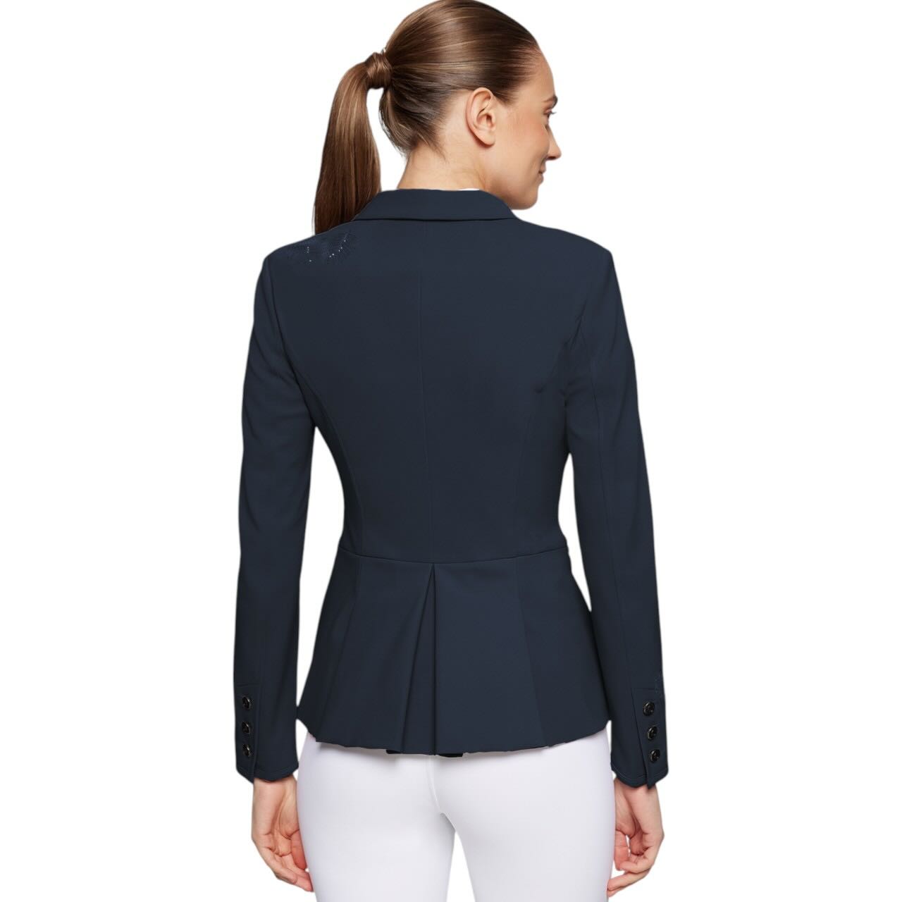 Die charakteristische Victorine-Passform verleiht dem Turnierjacket eine besonders elegante Silhouette. Der Schnitt ist vorne etwas kürzer und hinten leicht verlängert gestaltet. Dadurch entsteht eine dynamische und feminine Linienführung im Sattel. Gleichzeitig sorgt die Passform für einen modernen, sportlichen Look auf dem Turnier. Das Jacket schmiegt sich angenehm an den Körper an und unterstützt eine harmonische Reiterfigur. So kombinierst du stilvolle Optik mit funktionalem Design im Turniereinsatz.