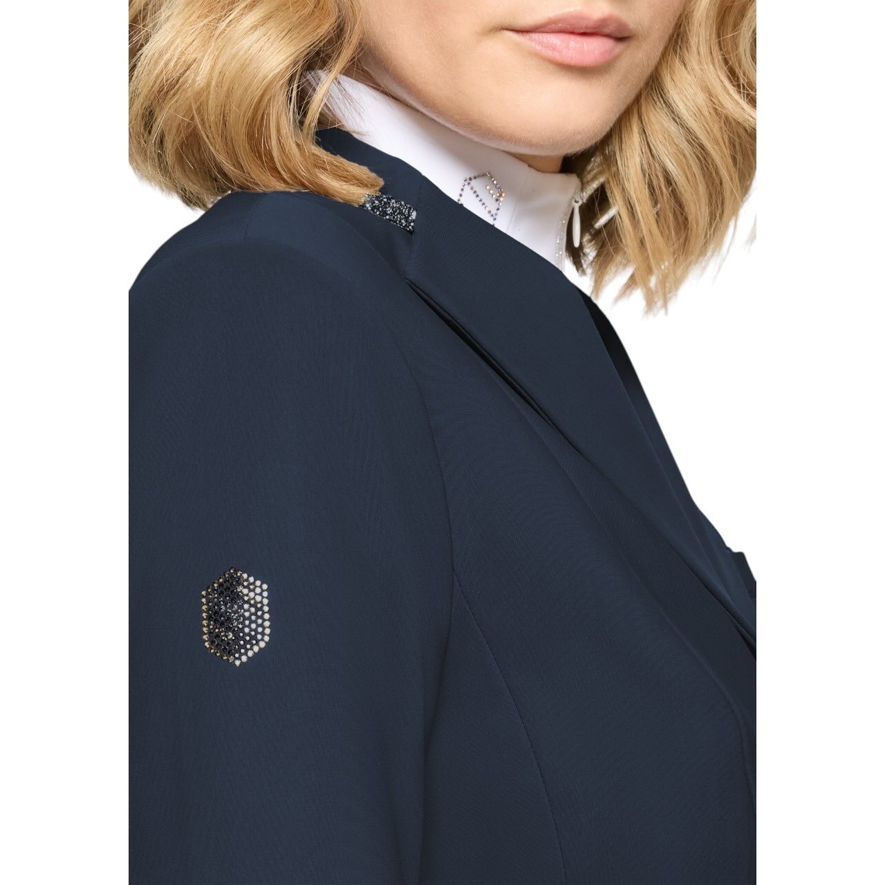 Die leichte Stretch-Mesh-Innenfütterung sorgt für optimale Luftzirkulation und ein besonders angenehmes Tragegefühl. Eine verdeckte Reißverschlusslösung hinter der Knopfleiste erleichtert das An- und Ausziehen und sorgt für sicheren Halt. Dezente Swarovski-Kristalle am Kragen und an der Fronttasche setzen stilvolle Akzente. Ergänzt wird das Design durch das charakteristische Samshield Crystal-Blazon und hochwertige, individuell gestaltete Knöpfe. Diese Details verleihen dem Jacket eine exklusive und elegante Optik. Zudem ist das Modell mit dem Airbag Zip’in System kompatibel und damit ideal für moderne Sicherheitskonzepte im Reitsport.