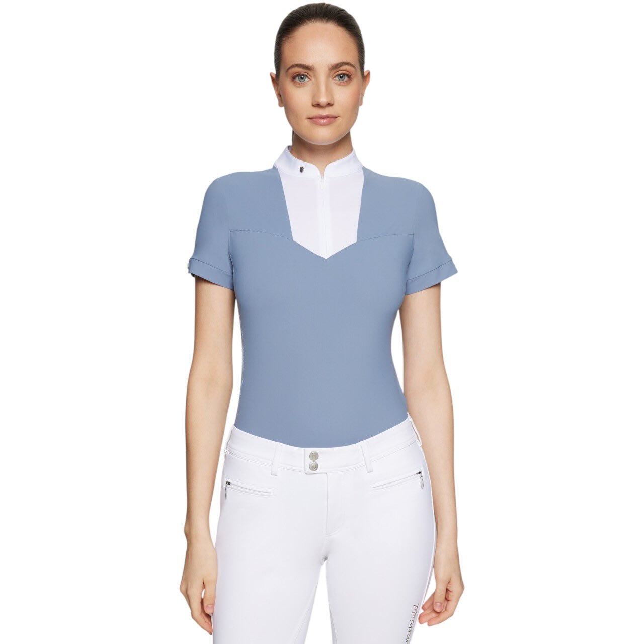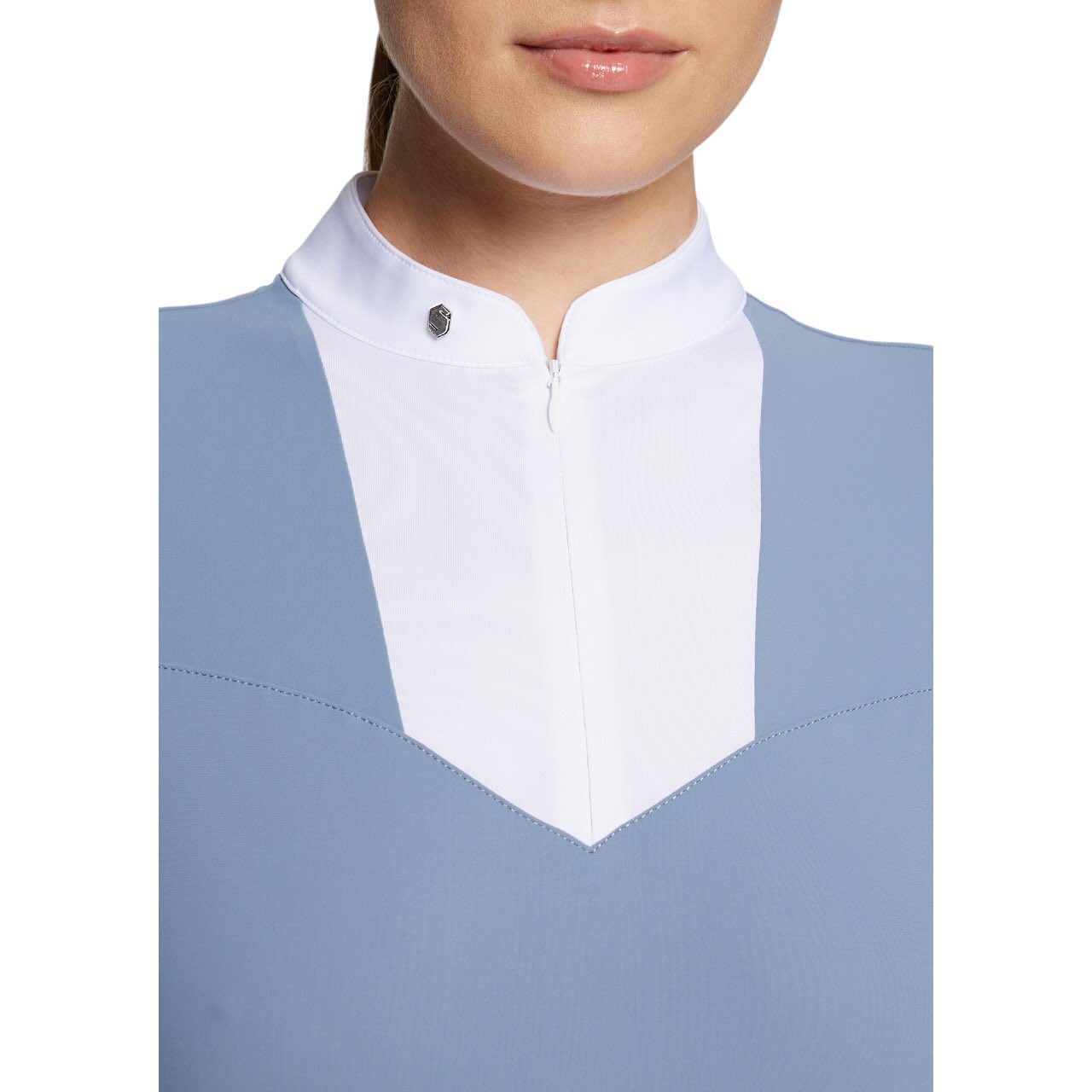 Optisch überzeugt das Shirt mit einer stilvollen und modernen Turnierästhetik. Die weiße V-förmige Frontpartie sorgt für einen klassischen Look im Sattel. Ein dezenter, unsichtbarer Half-Zip erleichtert das An- und Ausziehen. Der tropfenförmige Rückenschlitz verbessert zusätzlich die Belüftung. Am Kragen setzt ein Samshield-Blason-Rivet einen eleganten Akzent. Abgerundet wird das Design durch das Samshield-Logo mit edlen Swarovski® Kristallen.