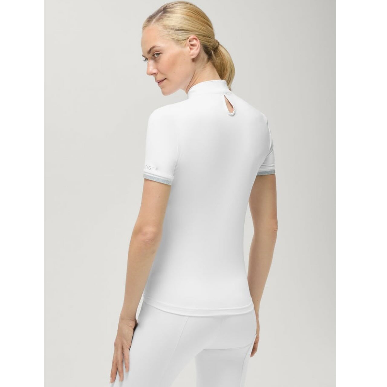 Optisch überzeugt das Turniershirt mit stilvollen Details, die perfekt zum klassischen Turnierlook passen. Der Baumwoll-Mix-Kragen sorgt für eine elegante Optik und angenehmen Tragekomfort. Druckknöpfe fixieren die Kragenspitzen zuverlässig und halten alles sauber in Position. Ein verdeckter Reißverschluss erleichtert das Anziehen und sorgt für eine klare, hochwertige Optik. Der Kragen mit Strassbesatz setzt dezente, edle Akzente. Silberne Lurex-Bündchen verleihen dem Shirt zusätzlich einen sportlich-eleganten Charakter.