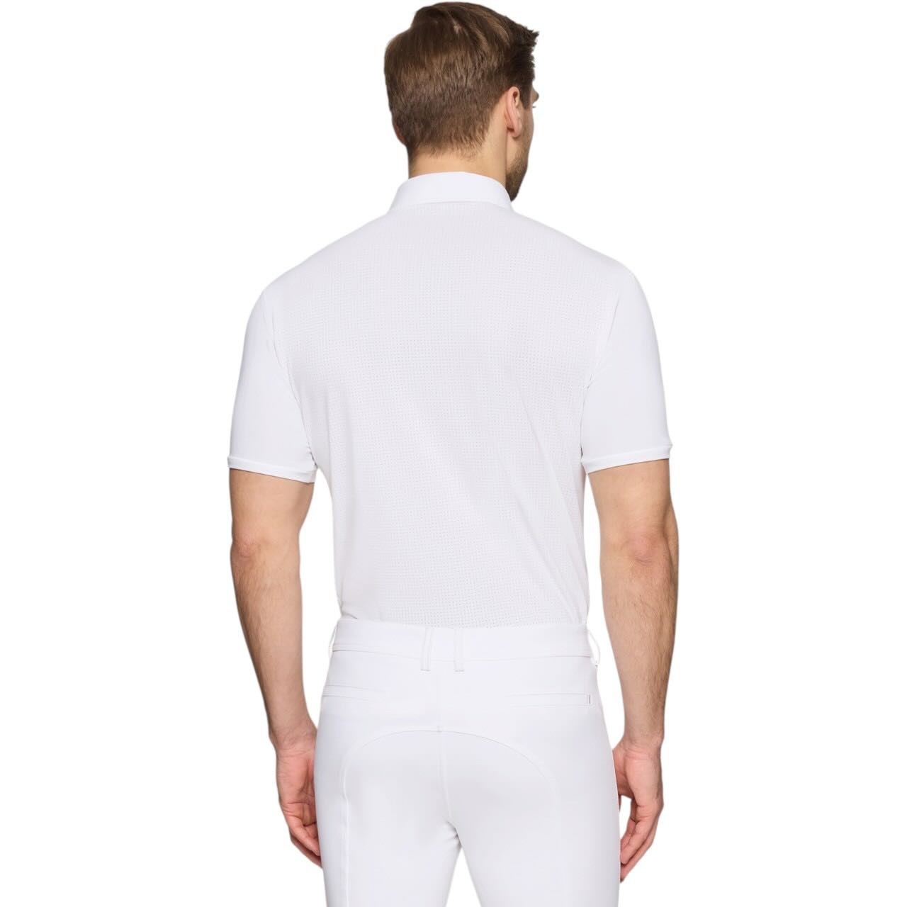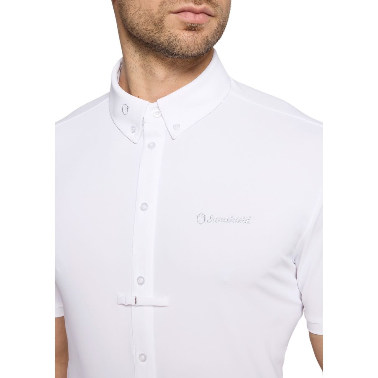 Optisch überzeugt das Shirt durch stilvolle Kontrastdetails und eine moderne, sportliche Linienführung. Der weiße Kragen verleiht dem Oberteil einen klassischen Turnier-Look. Eine integrierte Schlaufe ermöglicht das einfache Durchführen einer Turnierkrawatte. Der verdeckte Half-Zip wird elegant hinter kontrastierenden Knöpfen verborgen. Auf dem Kragen befindet sich das kontrastierende Samshield-Blazon als hochwertiges Stickdetail. Das dezente Samshield-Logo auf der Brust unterstreicht den exklusiven Charakter des Shirts. Dadurch eignet sich das Modell sowohl für Training als auch für den Einsatz auf Turnieren.