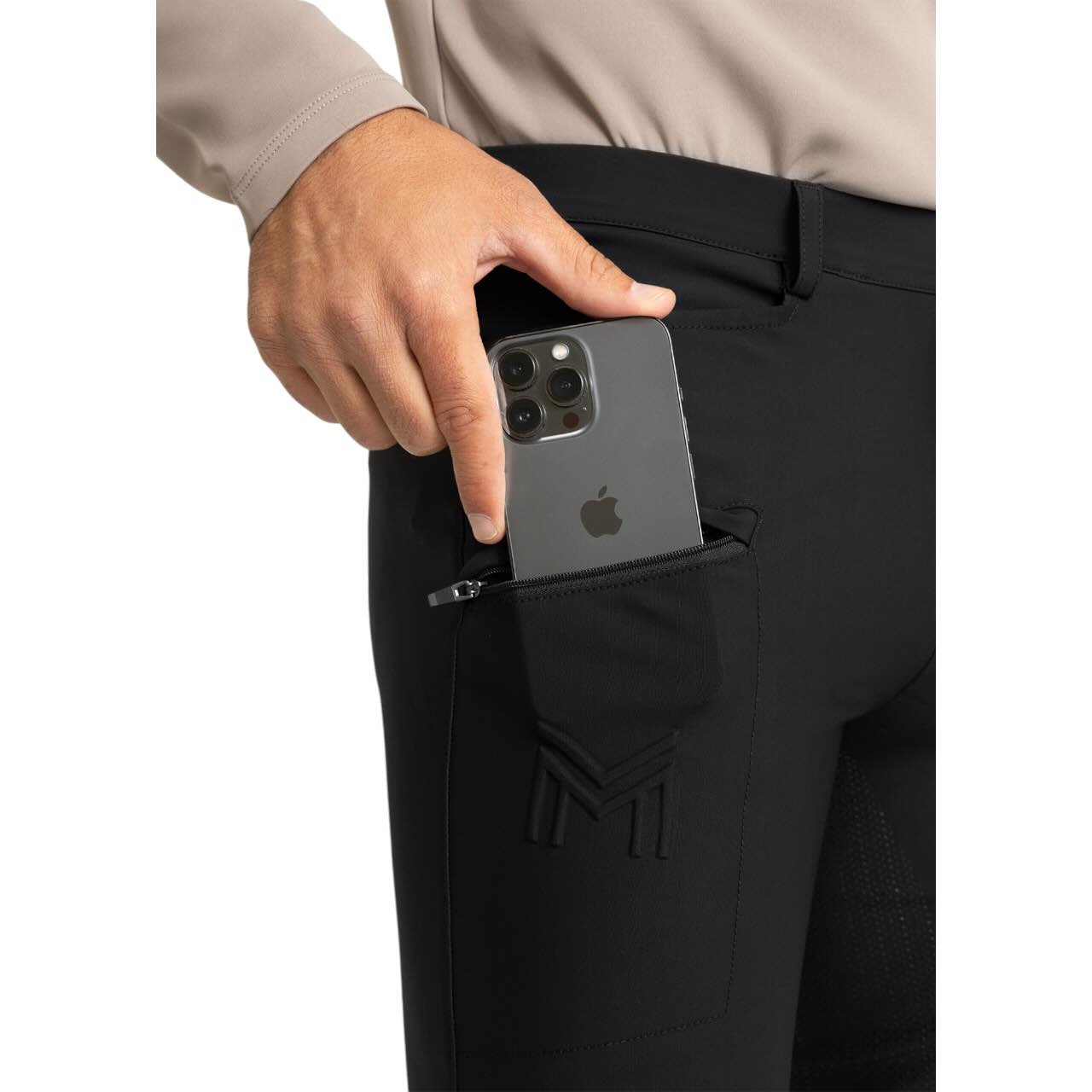Mit dem integrierten Full-Grip-Silikonbesatz profitierst du von sicherem Halt im Sattel – auch bei dynamischen Bewegungsabläufen. Ein Silikonstreifen auf der Innenseite des Bundes verhindert das Hochrutschen deines Oberteils und sorgt für ein ordentliches Erscheinungsbild. Die Reithose ist mit zwei funktionalen Fronttaschen sowie zwei Gesäßtaschen ausgestattet – praktisch für kleine Utensilien. Besonders clever: eine versteckte Handytasche mit Reißverschluss hält dein Smartphone sicher während des Reitens. So bleiben Funktionalität und Stil auch bei kalten Temperaturen erhalten.