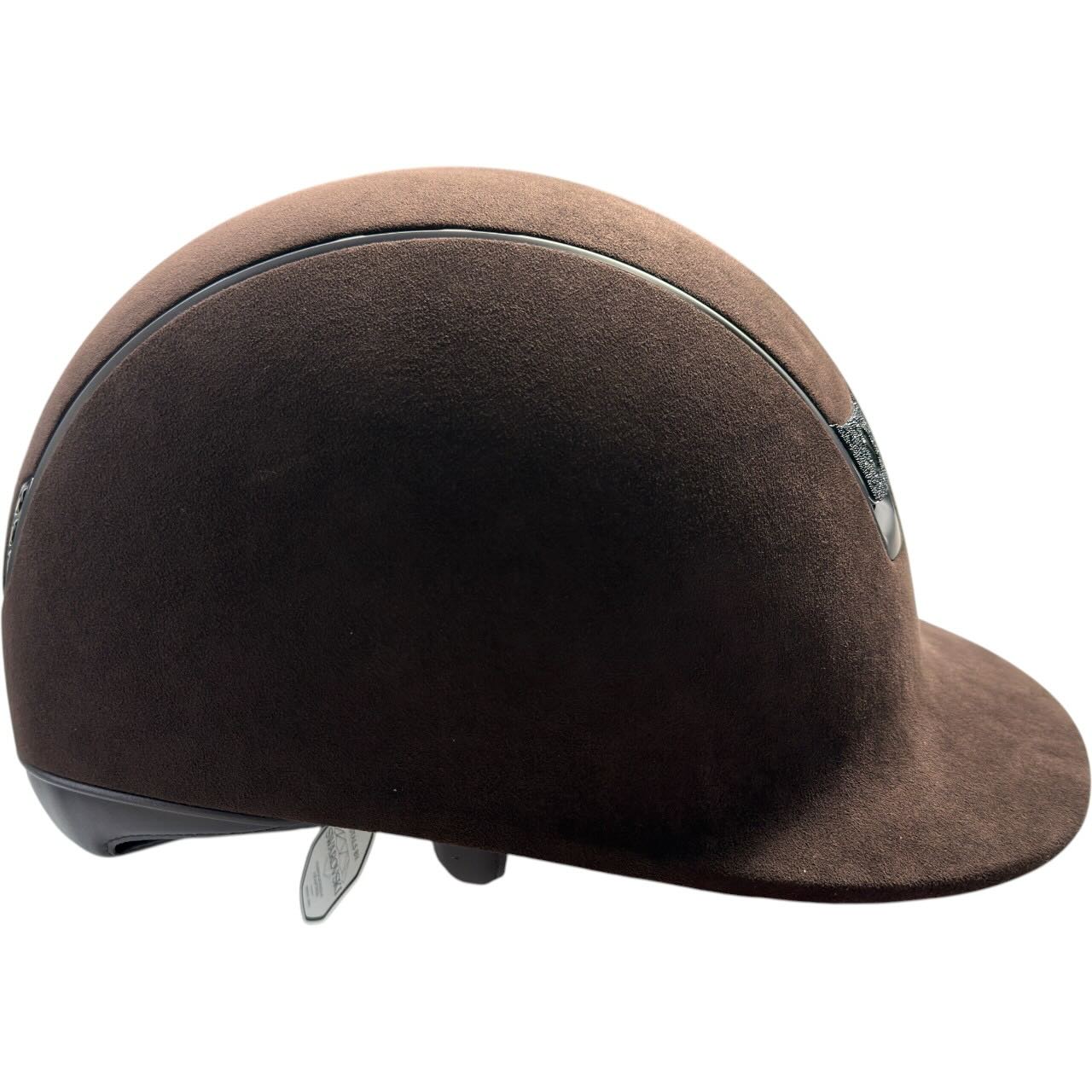 Der Reithelm Miss Shield 2.0 besticht durch seine zeitlose Ästhetik in brauner Alcantara Optik. Die Kombination aus Alcantara und dem Crystal Fabric Black Blason verleiht dem Helm einen edlen Glanz. Dieses Design sorgt nicht nur für einen stilvollen Auftritt, sondern bietet auch optimalen Schutz.