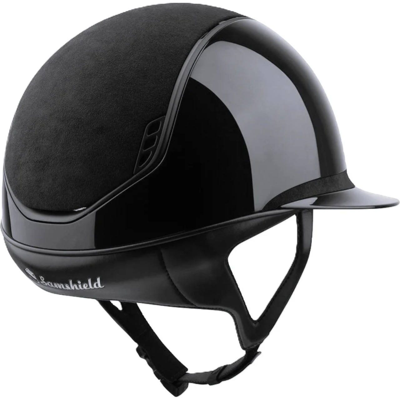 Reithelm Miss Shield 2.0 Shadowglossy Black | Alcantara Black | Matt Black von Samshield vereint maximale Sicherheit mit atemberaubendem Design. Erlebe den Komfort und die Sicherheit, die dich bei jedem Ritt begleiten, während du zugleich mit einem eleganten Look beeindruckst.