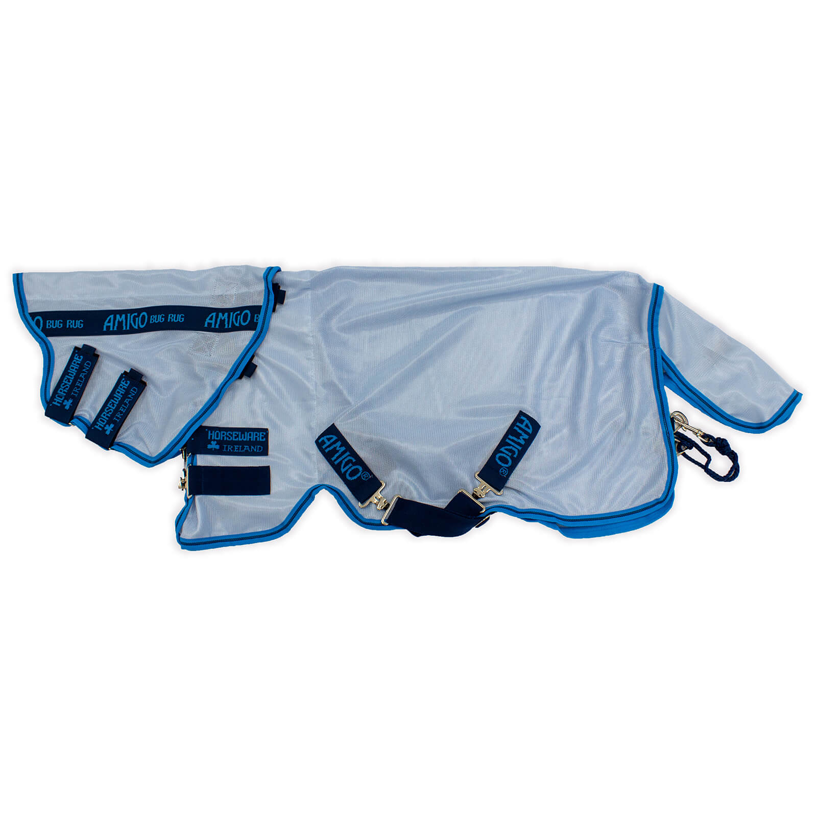 Die Fliegendecke Amigo Bug Rug besticht durch ihre frischen Farben in Azure Blue, Electric Blue & Navy, die deinem Pferd ein stilvolles Aussehen verleihen. Das abnehmbare Halsteil sorgt für Flexibilität und zusätzlichen Schutz. Die durchdachte Passform mit speziellem Vorderbeinausschnitt und geradem Brustverschluss minimiert Scheuerstellen und garantiert perfekten Sitz.