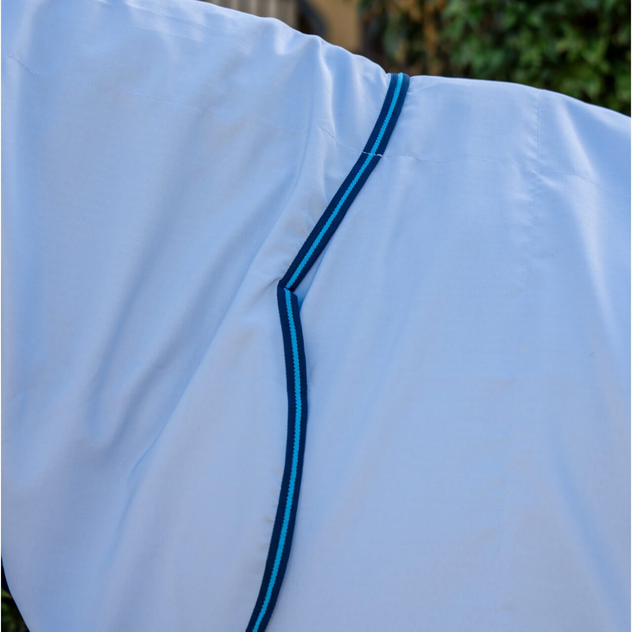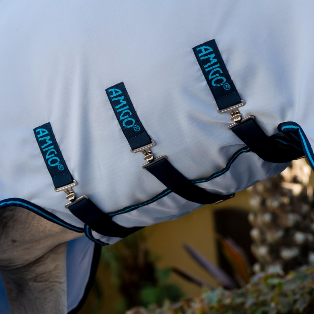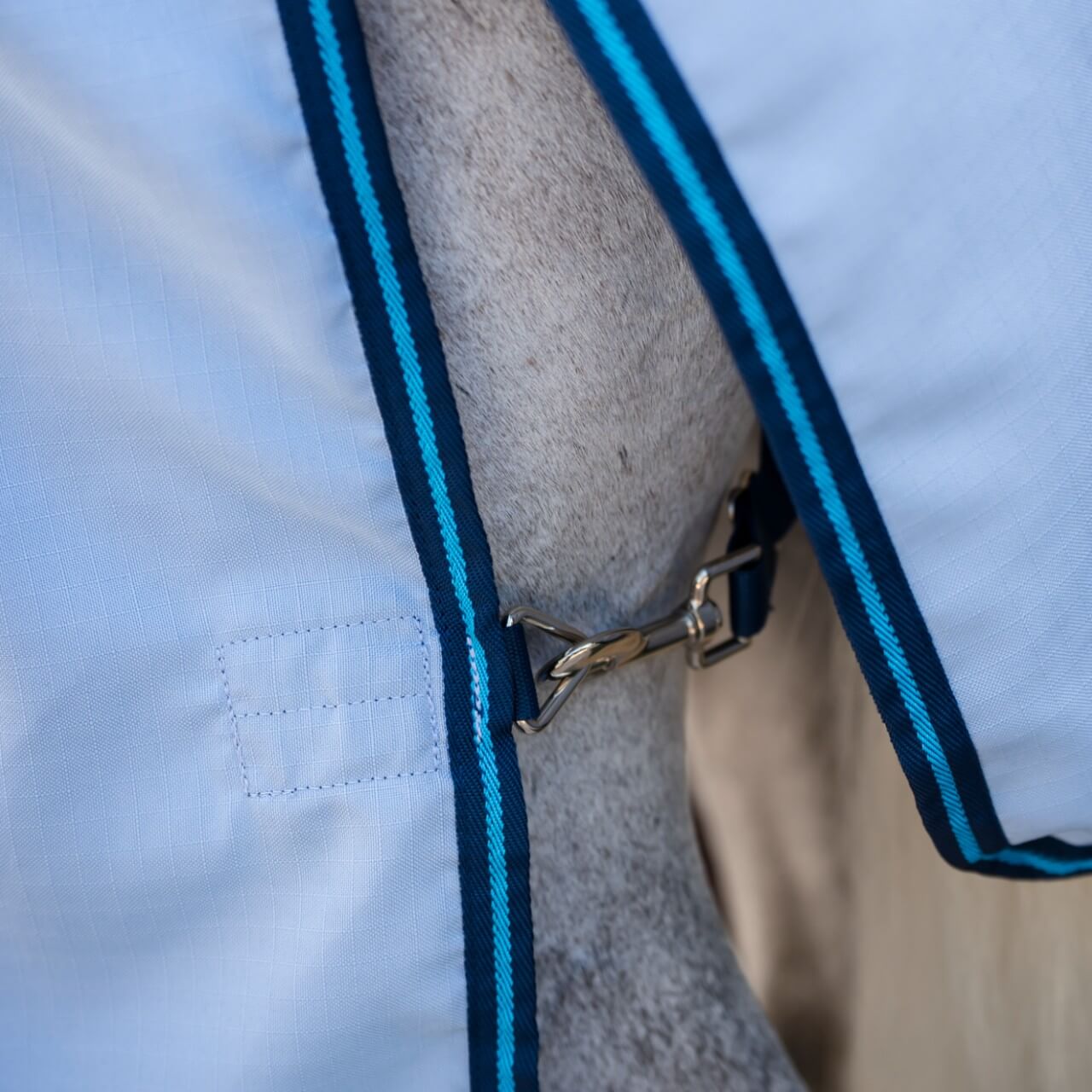 Die Fliegendecke Amigo Ripstop Hoody überzeugt mit ihrem eleganten Look in Azure Blue/Strong Blue/Silver. Das abnehmbare Halsteil und die extra große Schweifklappe sorgen nicht nur für zusätzlichen Schutz, sondern auch für eine flexible Anpassung an die Wetterbedingungen. Die gekreuzten Bauchgurte und der gerade Frontverschluss gewährleisten eine perfekte Passform und verhindern ein Verrutschen der Decke.
