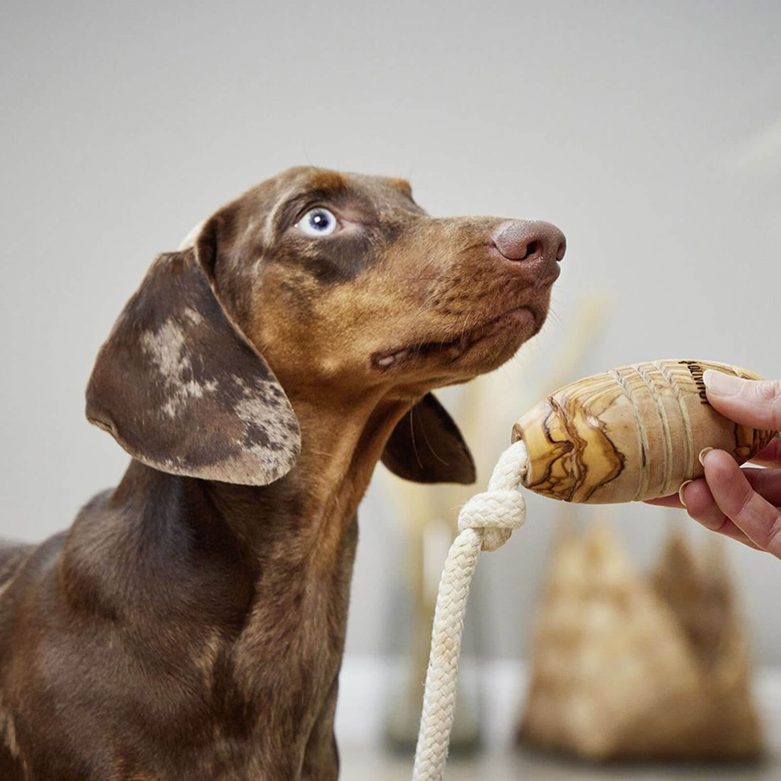 Mit seinem einzigartigen Erscheinungsbild aus Olivenholz und natürlichem Baumwolltau zieht das Hundespielzeug Olivi Rugby Tau-Spielzeug alle Blicke auf sich. Die elegante Maserung des Holzes und der angenehme Duft verleihen dem Spielzeug eine besondere Optik, die nicht nur ästhetisch ansprechend, sondern auch praktisch ist. Die natürliche Struktur des Holzes bietet deinem Hund einen hervorragenden Griff und unterstützt gleichzeitig den natürlichen Kauprozess.