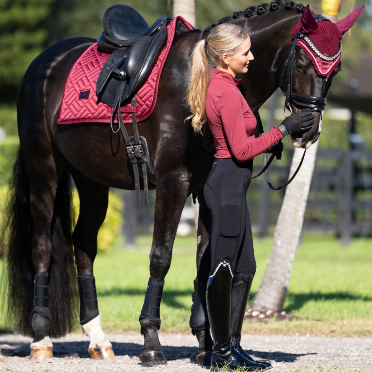 Die Modern Bordeaux Schabracke ist aus besonders atmungsaktiven Stoffen gefertigt, die ein angenehmes Klima unter dem Sattel gewährleisten. Durch das schnelltrocknende Innenmaterial bleibt die Rückenpartie deines Pferdes stets trocken. Die anatomische Passform unterstützt die Druckverteilung und verhindert Verrutschen. Für zusätzlichen Komfort sorgt eine weiche Polsterung, die sich optimal an den Pferderücken anschmiegt. Die Sattellage bleibt durch eine verstärkte Oberfläche besonders langlebig. Diese Schabracke erfüllt höchste Ansprüche im täglichen Einsatz – ganz gleich, ob beim Training oder auf dem Turnier.