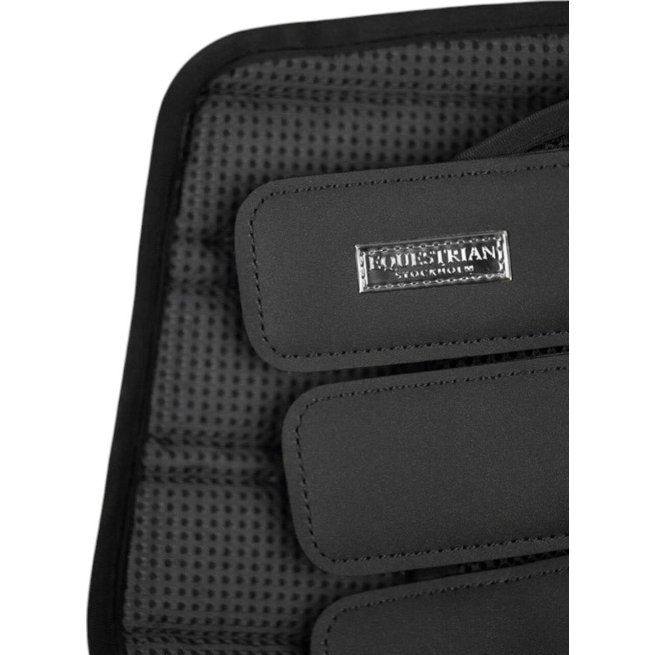 Mit ihrer edlen schwarzen Optik und dem silberfarbenen Equestrian Stockholm-Abzeichen setzen die Gamaschen auch optisch ein Statement. Sie passen ideal zu jeder Dressurausrüstung und unterstreichen den eleganten Auftritt deines Pferdes im Viereck. Das harmonische Design vereint Funktionalität mit einem Hauch Luxus. Zudem sind die Gamaschen besonders pflegeleicht: einfach bei 30 °C in der Maschine waschbar, Klettverschlüsse vorher schließen. Bitte nicht im Trockner trocknen. So bleibt die Qualität lange erhalten und du hast dauerhaft Freude an diesem stilvollen Begleiter.