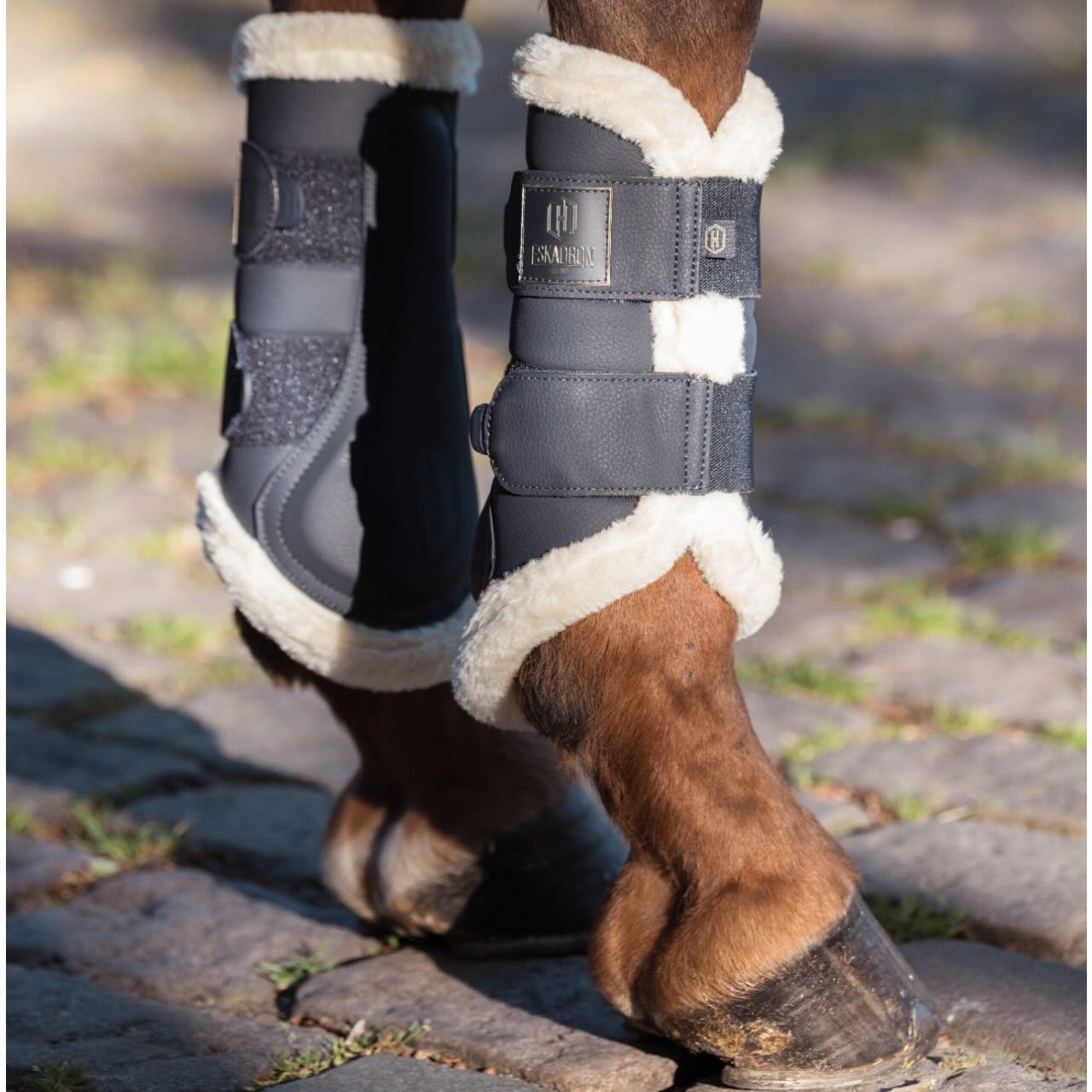 Die weiche Faux Fur-Einfassung schützt empfindliche Pferdebeine zuverlässig vor Reibung und Druckstellen. Im Inneren sorgt eine PU-Einlage in der Streichschutzzone für maximale Sicherheit und Stoßdämpfung. Selbst bei energischen Bewegungen bleibt der Beinschutz formstabil und angenehm flexibel. Die elastischen Klettverschlüsse ermöglichen eine präzise Anpassung und sicheren Halt. Das geprägte Eskadron-Logo in der PU-Zone unterstreicht den exklusiven Charakter. So erhältst du ein Produkt, das Funktionalität und Stil perfekt vereint.