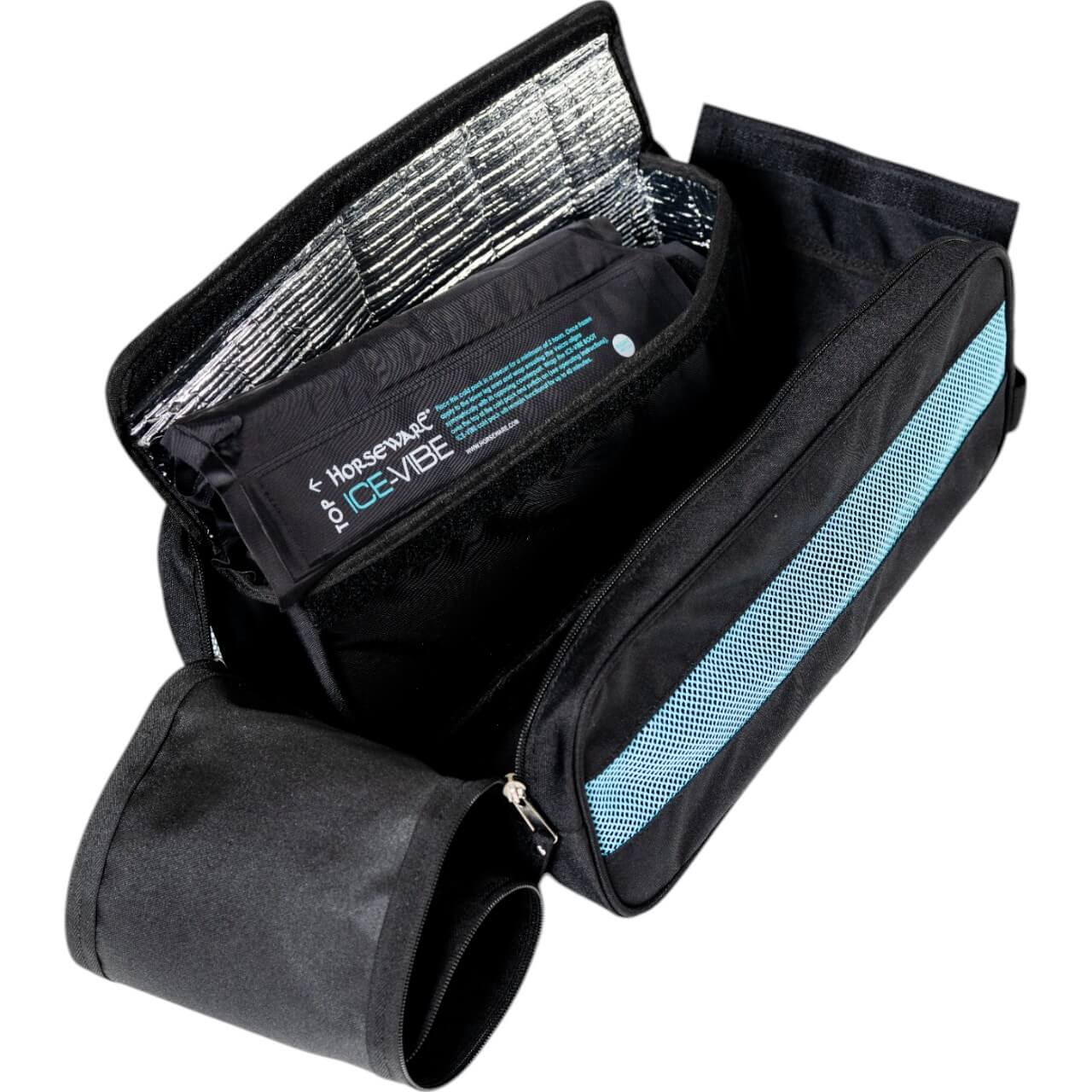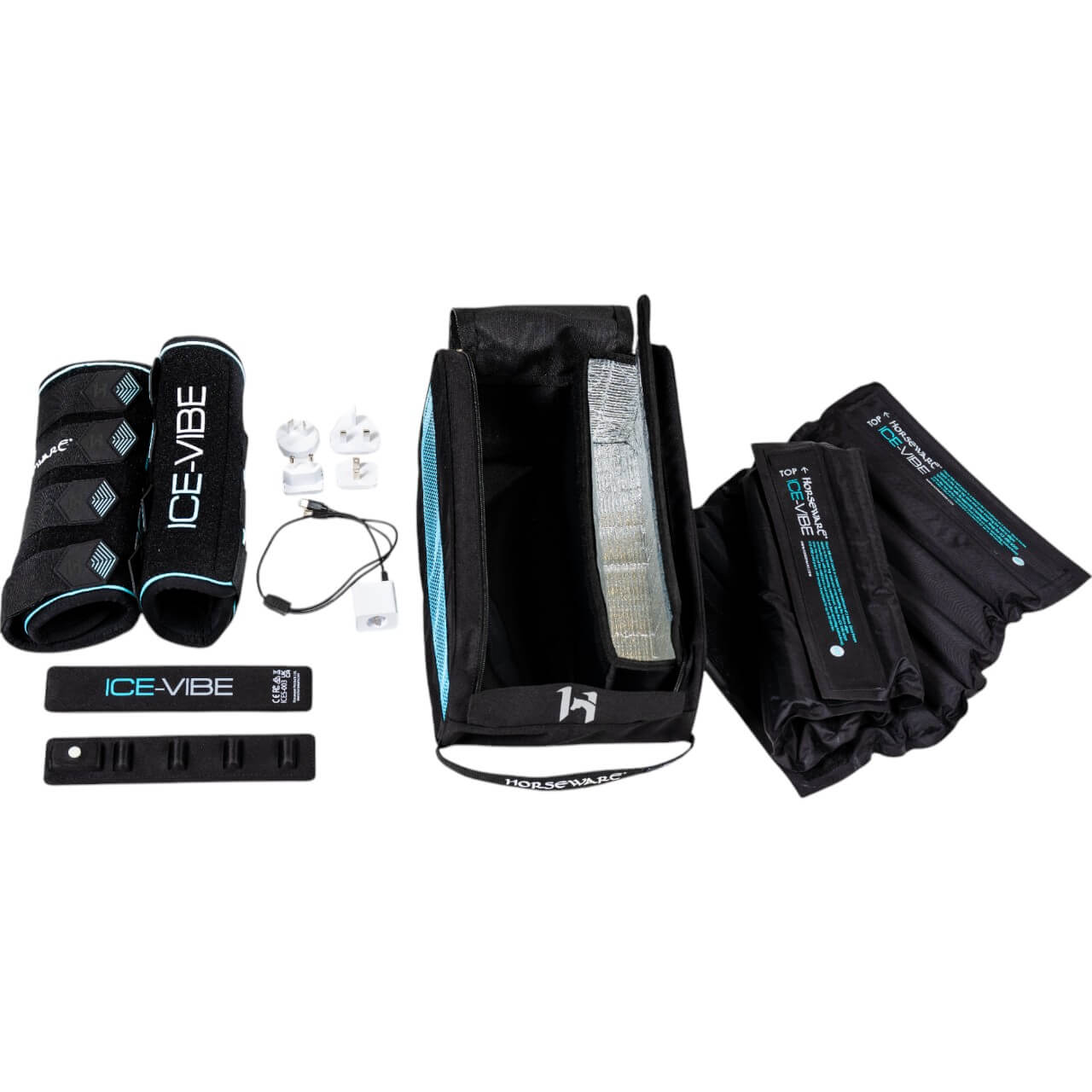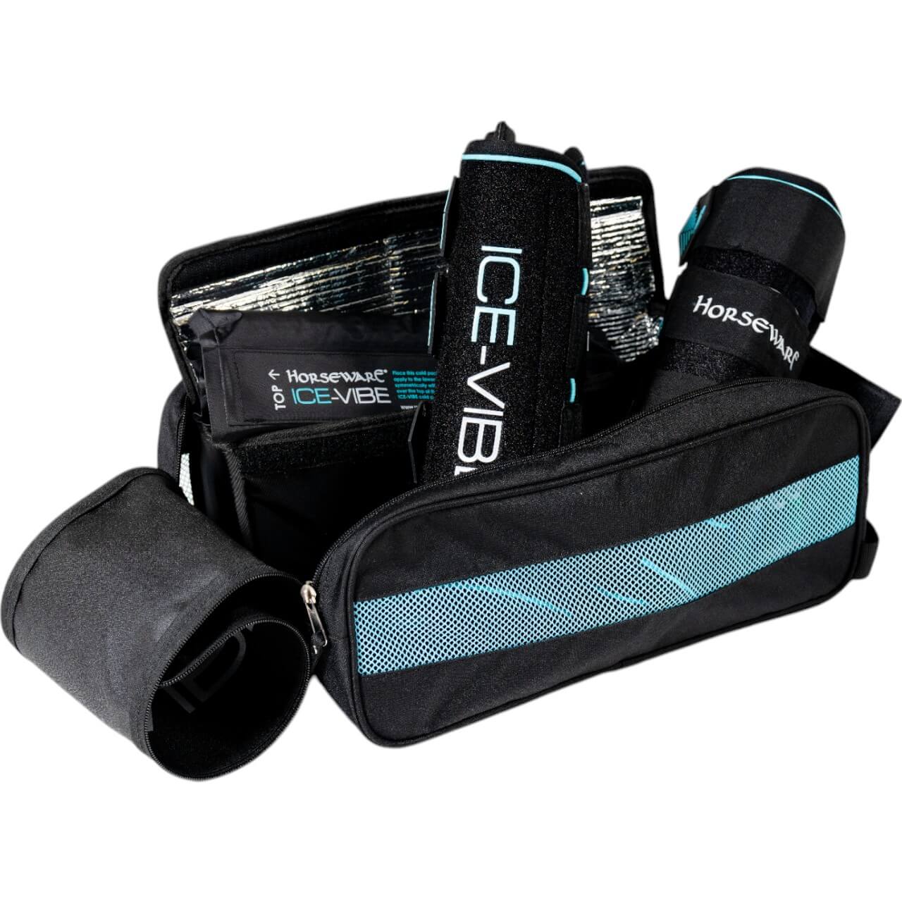 Die Ice-Vibe Leg Wraps präsentieren sich in einem modernen Black/Aqua-Design, das sowohl stilvoll als auch praktisch ist. Die flexible Passform passt sich optimal den Konturen der Pferdebeine an und sorgt für Komfort ohne Druckstellen. Dank der elastischen Klettverschlüsse lassen sich die Gamaschen sicher befestigen und einfach anpassen.