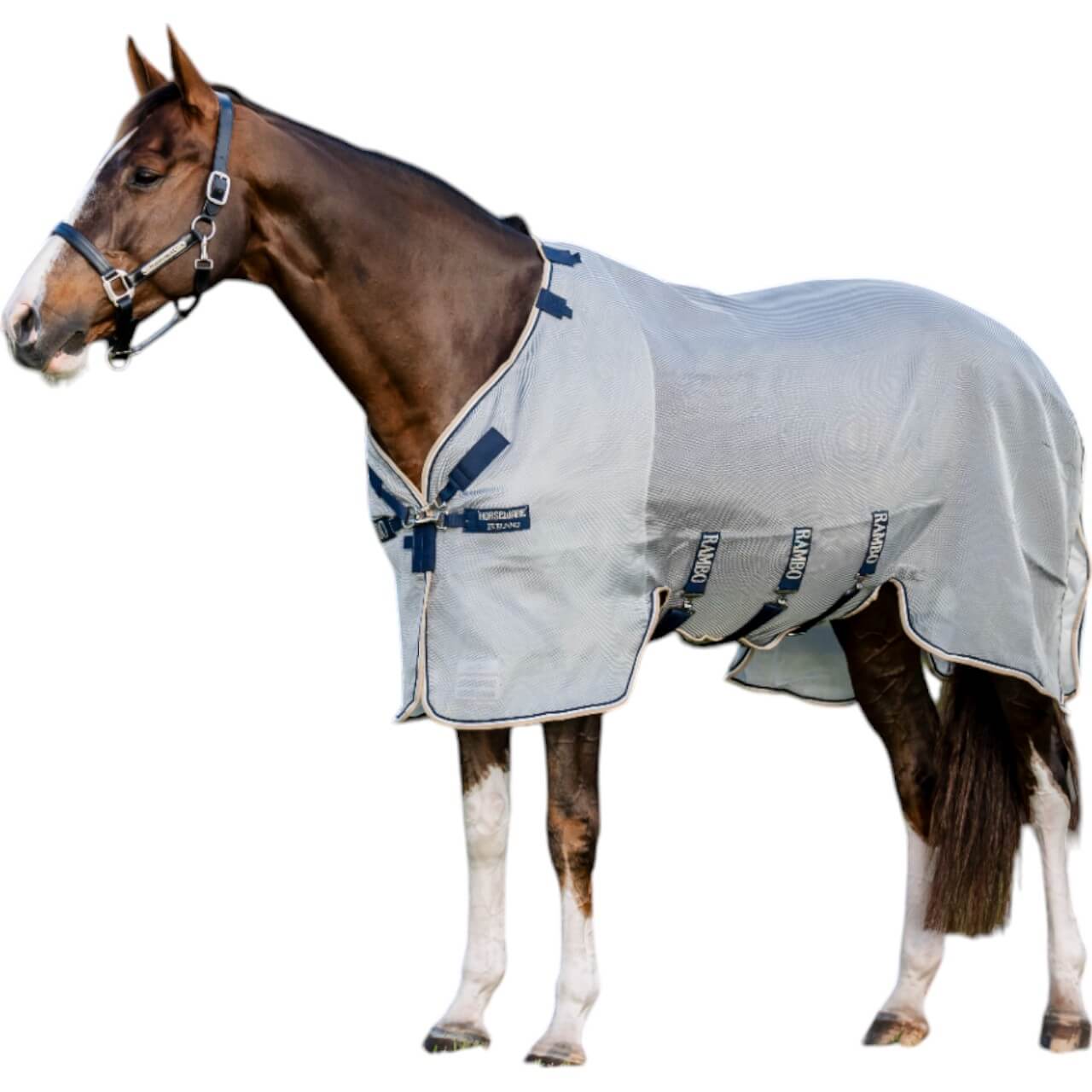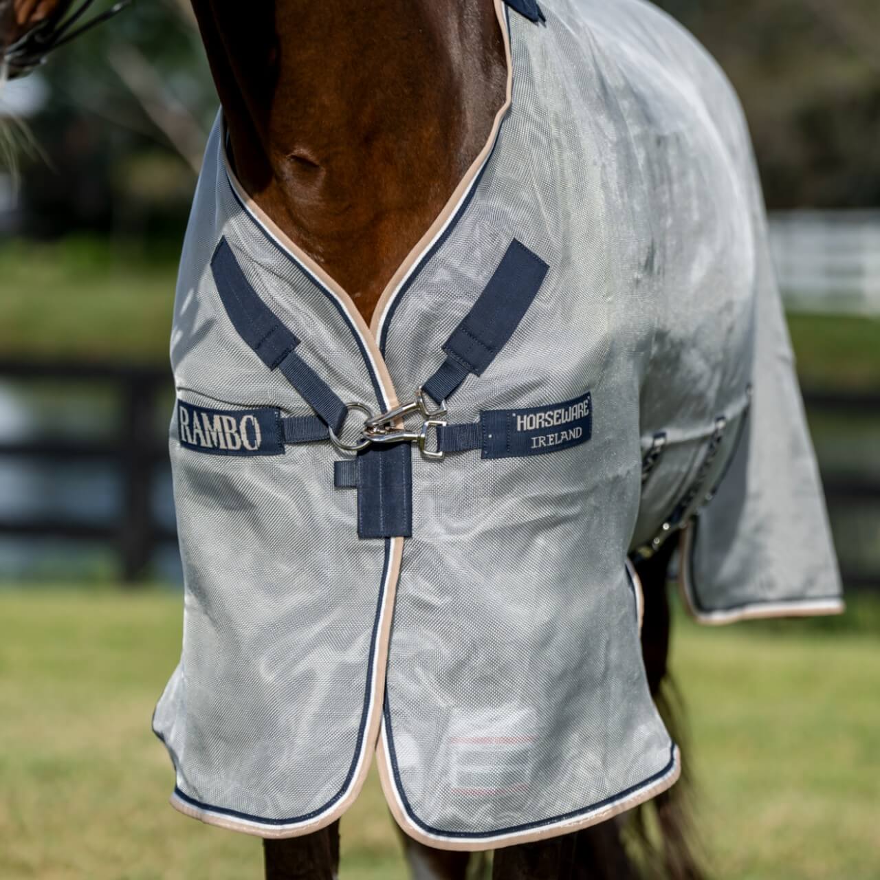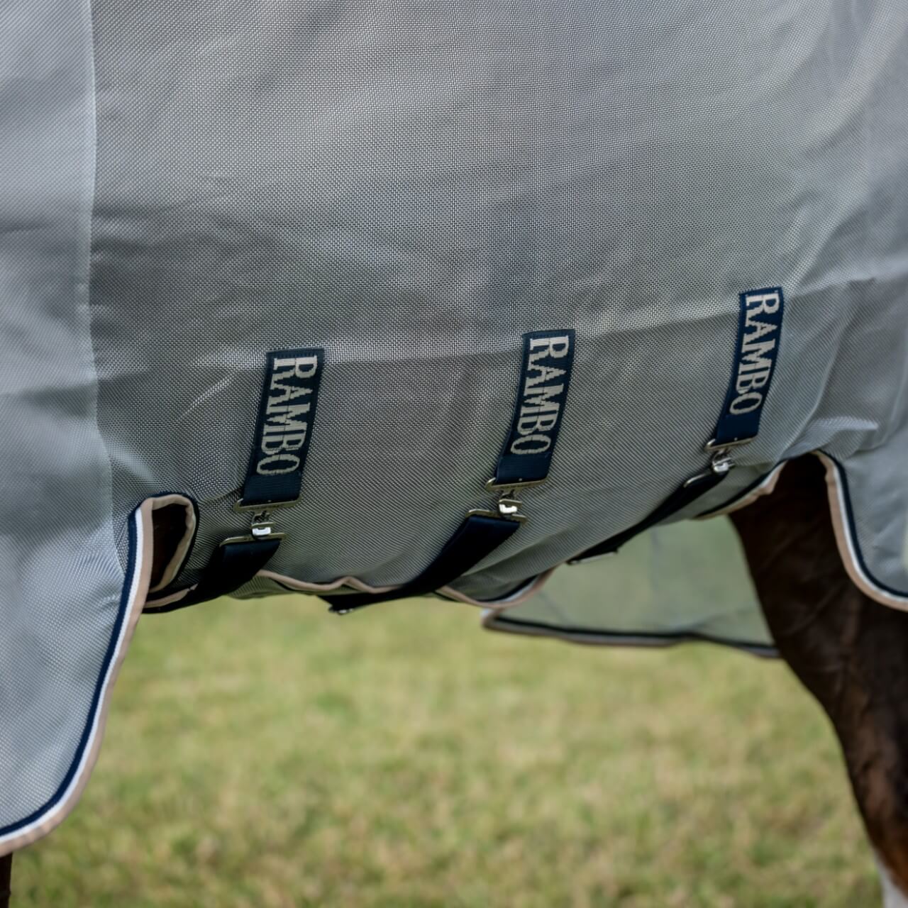 Die Fliegendecke Rambo Protector besticht durch ihre stilvolle Farbkombination aus Silver/Navy, White & Beige. Das hochwertige Polyester- und Nylonmaterial sorgt nicht nur für ein ansprechendes Erscheinungsbild, sondern bietet auch praktische Vorteile wie Langlebigkeit und Atmungsaktivität – ideal für heiße Sommertage.