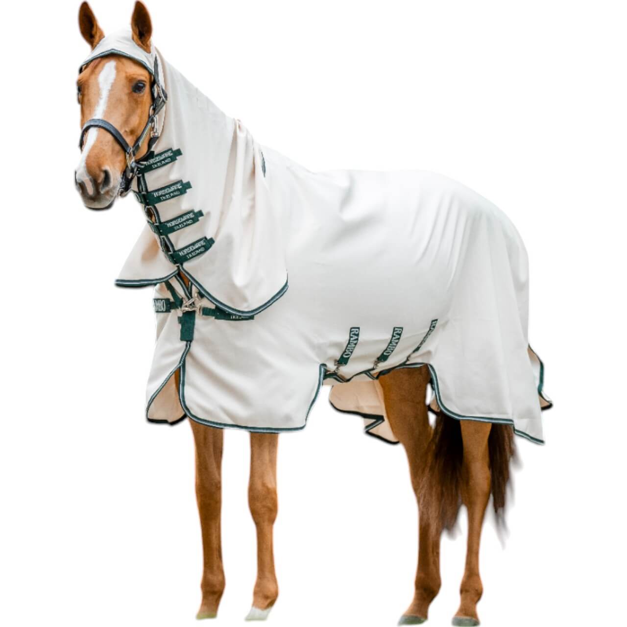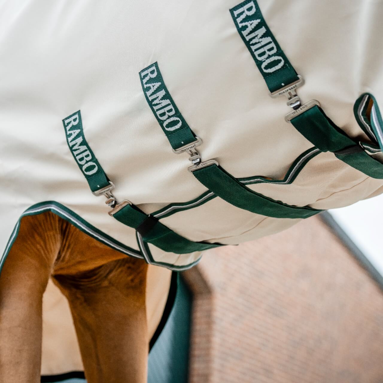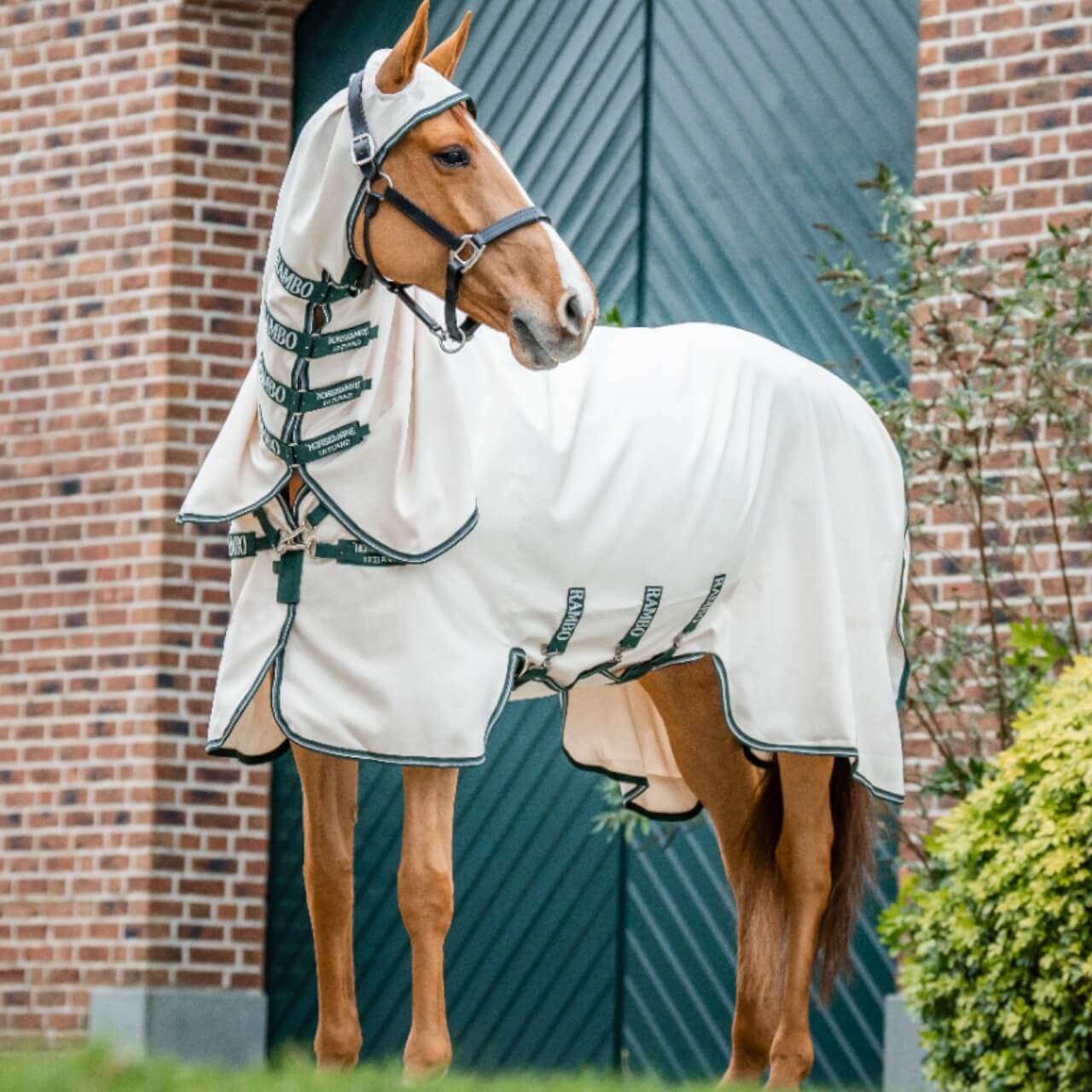 Die Rambo Hoody Fliegendecke besticht durch ihre stilvolle Farbgebung in Chalk/Hunter Green & Silver, die deinem Pferd einen edlen Look verleiht. Das integrierte Halsteil sorgt nicht nur für ein harmonisches Erscheinungsbild, sondern bietet auch umfassenden Schutz bis zu den Ohren. Dank des V-Vorderverschluss-Systems und des Sure Fit-Halsausschnitts sitzt die Decke passgenau und komfortabel.