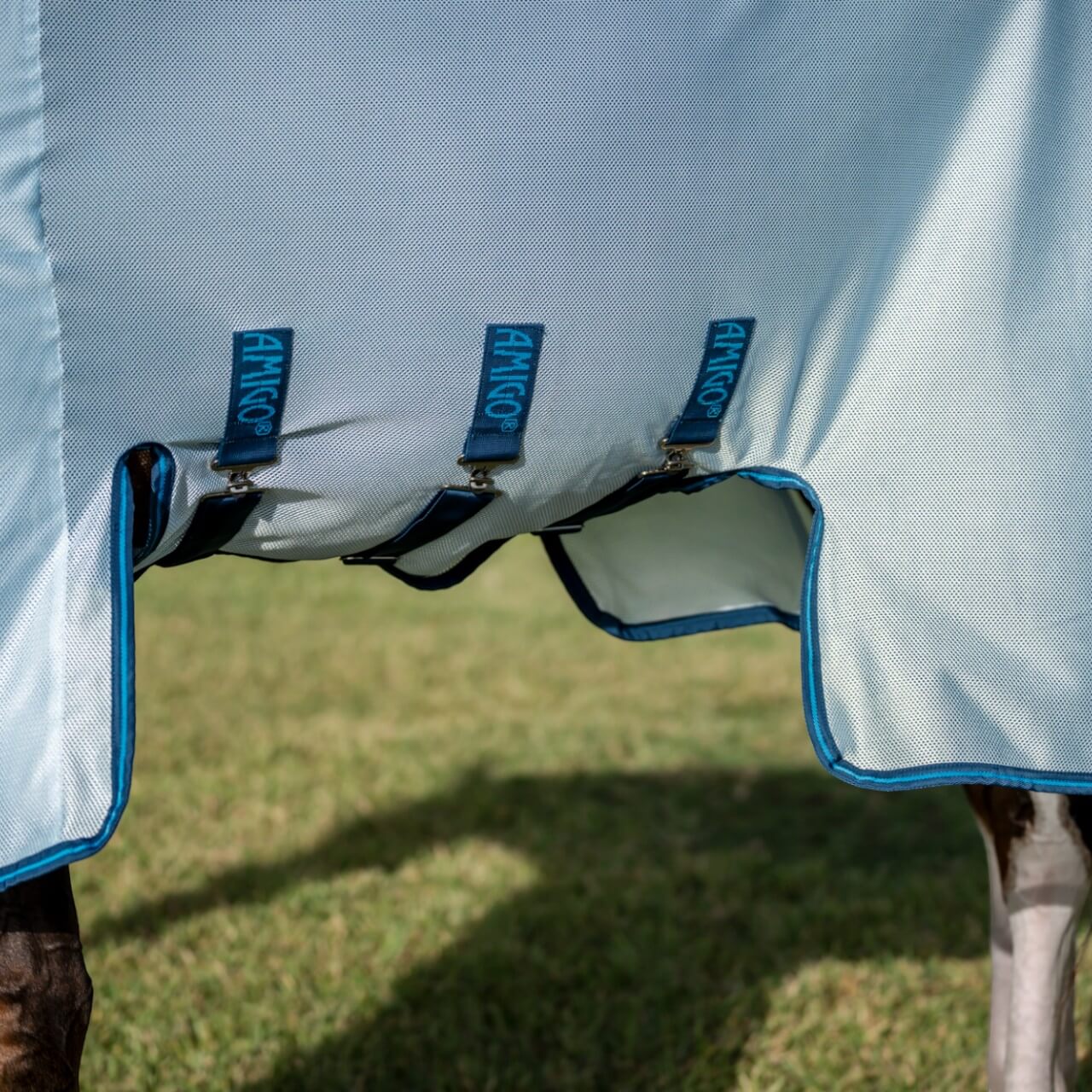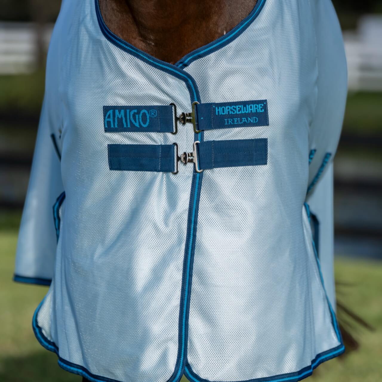 Die Fliegendecke Amigo Bug Buster beeindruckt mit einer stilvollen Farbgebung in Azure Blue/Navy & Electric Blue oder Silver/Titanium Grey & Silver. Das durchdachte Design vereint ästhetische Ansprüche mit praktischen Vorteilen, wie einem ergonomischen Vorderbeinausschnitt, der die Bewegungsfreiheit deines Pferdes erhält. Der gerade Brustverschluss sorgt für einen sicheren Sitz.