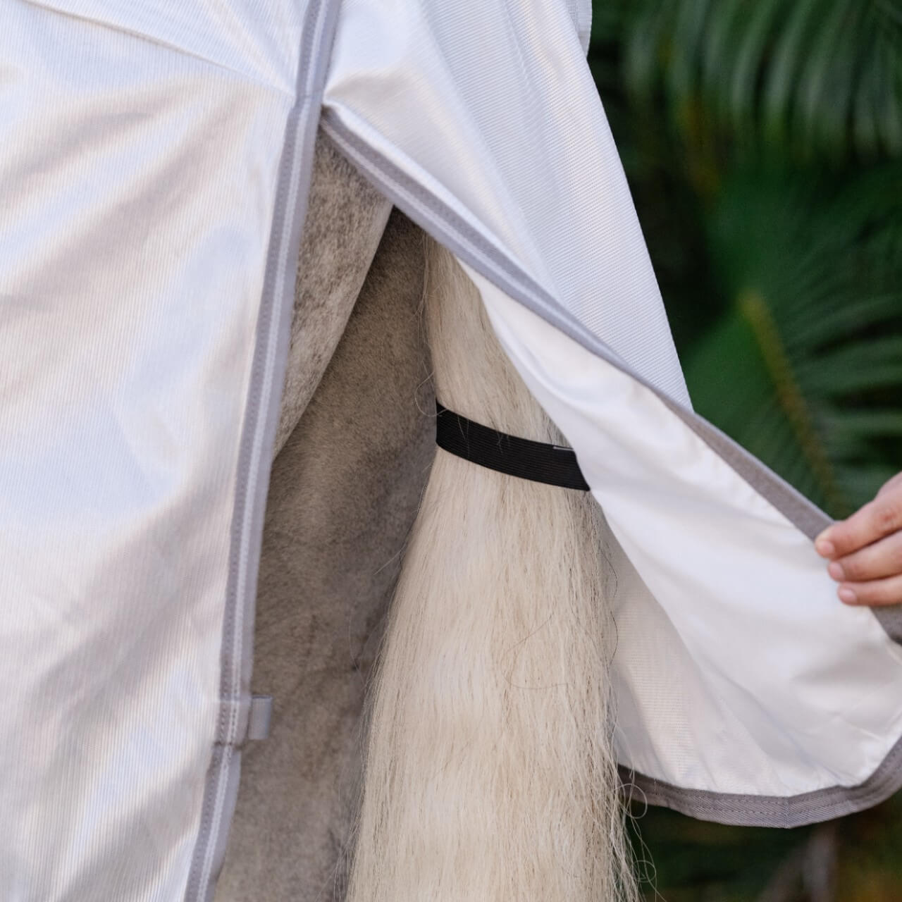 Neben dem Komfort überzeugt die Decke mit praktischen Features für den Alltag. Der gerade Vorderverschluss und die beiden Kreuzgurte garantieren einen sicheren Sitz auch bei Bewegung. Frontbeinschnallen und Schlaufen für Beinschnallen ermöglichen zusätzliche Stabilität und Anpassung. Die Schweifriemen bieten Halt und verhindern ein Verrutschen. Schulter-, Mähnen- und Schweifpartie sind mit glattem Futter unterlegt, um Scheuerstellen zu vermeiden. Der nicht abnehmbare Halsteil bleibt zuverlässig in Position – ohne Verrutschen oder Verrenkungen beim Anziehen.