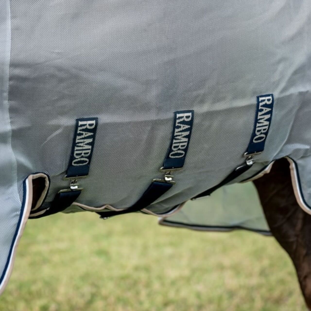 Der innovative V-Brustverschluss nimmt Druck von den Schultern und reduziert Reibung im empfindlichen Widerristbereich. In Kombination mit doppelten Beinausschnitten ermöglicht er deinem Pferd eine natürliche Bewegungsfreiheit beim Grasen und Laufen. Das seidige Innenfutter im Schulter-, Hals- und Schweifbereich unterstützt den Tragekomfort und schützt vor Scheuerstellen. Drei verstellbare Bauchgurte, stabile Klettverschlüsse und ein Schweifriemen sorgen für einen sicheren Sitz auch bei ausgelassenem Toben. Die anatomische Passform ist typisch für die bewährte Rambo®-Qualität. Für erweiterten Rundumschutz kannst du die Decke mit dem separat erhältlichen Rambo® Protector Halsteil kombinieren.