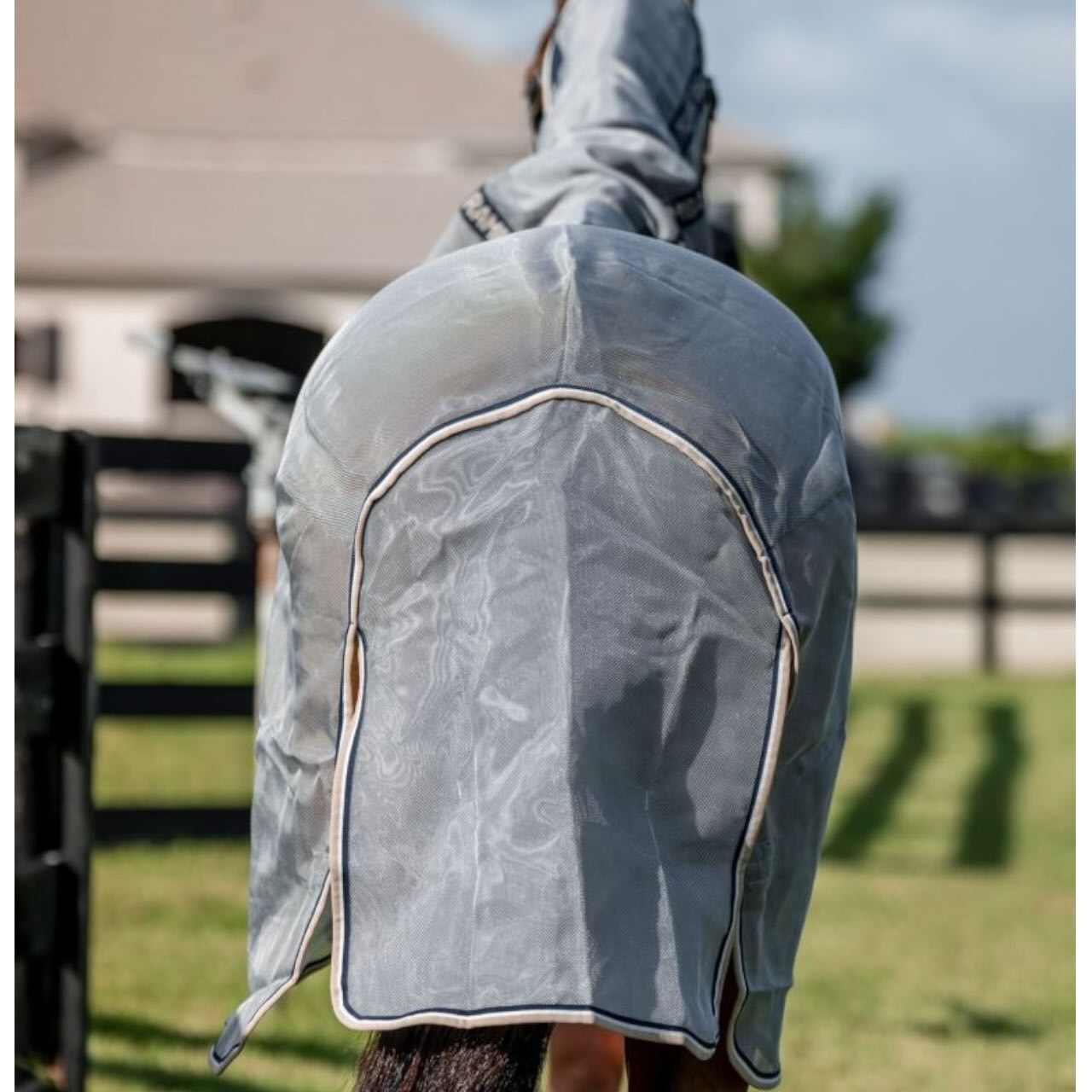 Die Decke ist im empfindlichen Schulter-, Mähnen- und Schweifbereich weich gefüttert. Das reduziert Reibung und unterstützt den Tragekomfort auch bei längerer Nutzung. Dual Leg Arches ermöglichen eine natürliche Bewegungsfreiheit beim Grasen und Laufen. Eine extra lange Schweifabdeckung schützt zusätzlich vor Insekten im empfindlichen Schweifbereich. Reflektierende Einfassungen verbessern die Sichtbarkeit deines Pferdes bei schlechten Lichtverhältnissen. Praktische Halsschlaufen erlauben das einfache Anbringen eines separat erhältlichen Halsteils.