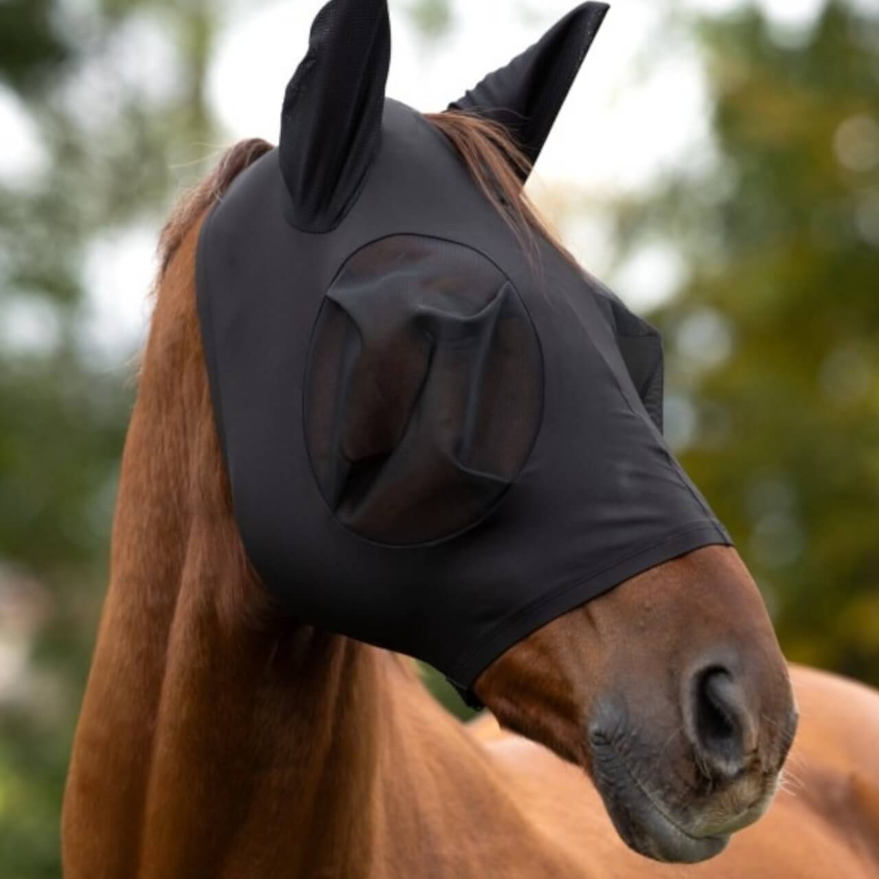 Die Fliegenmaske besticht durch ihre schlichte, aber elegante schwarze Optik, die sich harmonisch in jedes Reitoutfit einfügt. Das feinmaschige Netzgewebe ist nicht nur ein optisches Highlight, sondern bietet auch einen effektiven Schutz gegen kleinste Insekten. Dank der großzügig geschnittenen Augenpartie genießt dein Pferd uneingeschränkte Sicht und erhöhten Komfort.