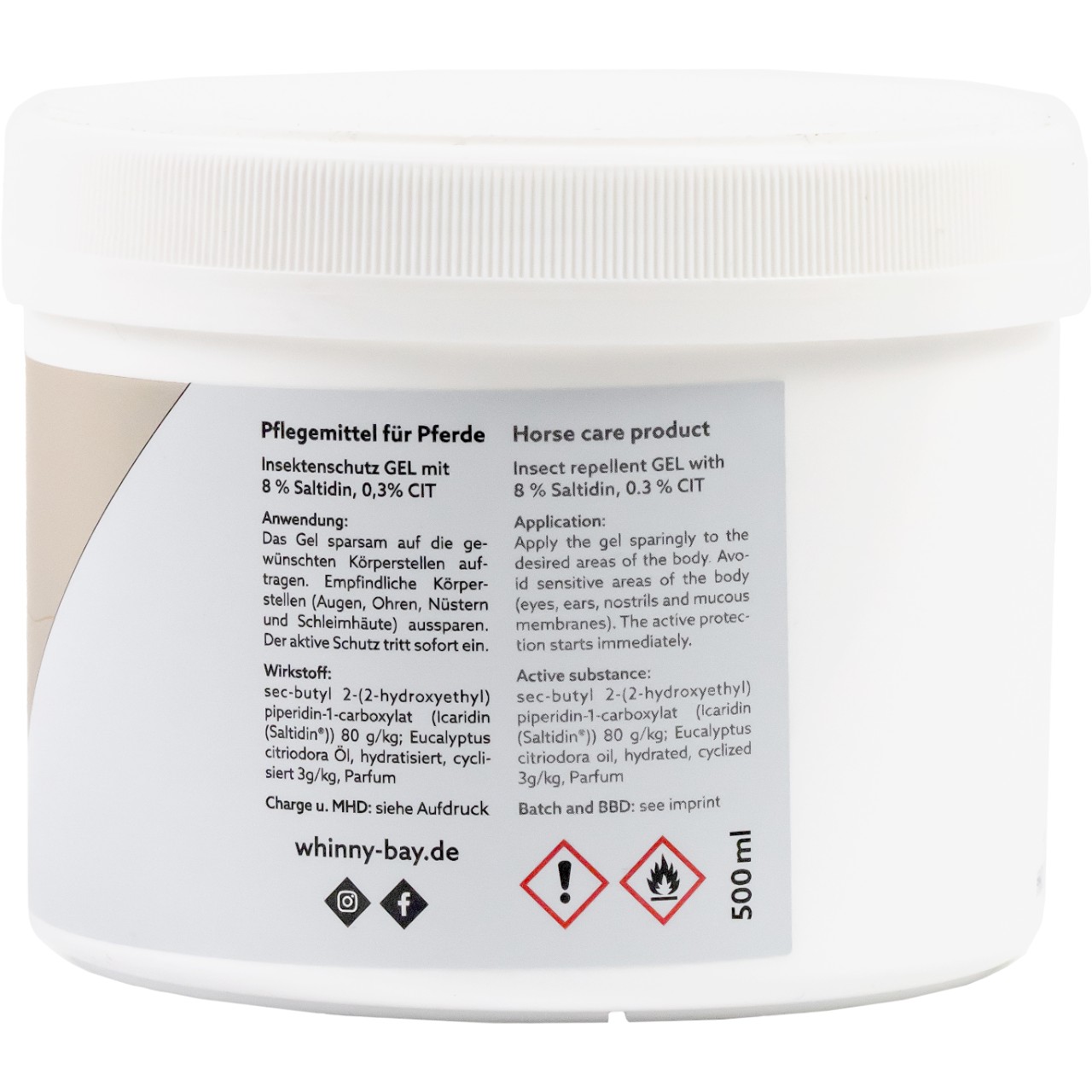 Das whinny X bay Insektenschutz Gel Mach die Fliege überzeugt durch seine leistungsstarke Formel mit 8 % Saltidin und 0,3 % CIT. Der enthaltene Wirkstoff sec-butyl 2-(2-hydroxyethyl) piperidin-1-carboxylat sorgt für einen langanhaltenden Schutz. Zusätzlich unterstützt hydratisiertes Eucalyptus citriodora Öl die Wirksamkeit des Gels. Die Schutzwirkung tritt sofort nach dem Auftragen ein und hält über einen langen Zeitraum an. Durch seine ausgeklügelte Zusammensetzung ist das Gel ideal für empfindliche Pferde. Es vereint zuverlässigen Schutz mit pflegenden Eigenschaften.
