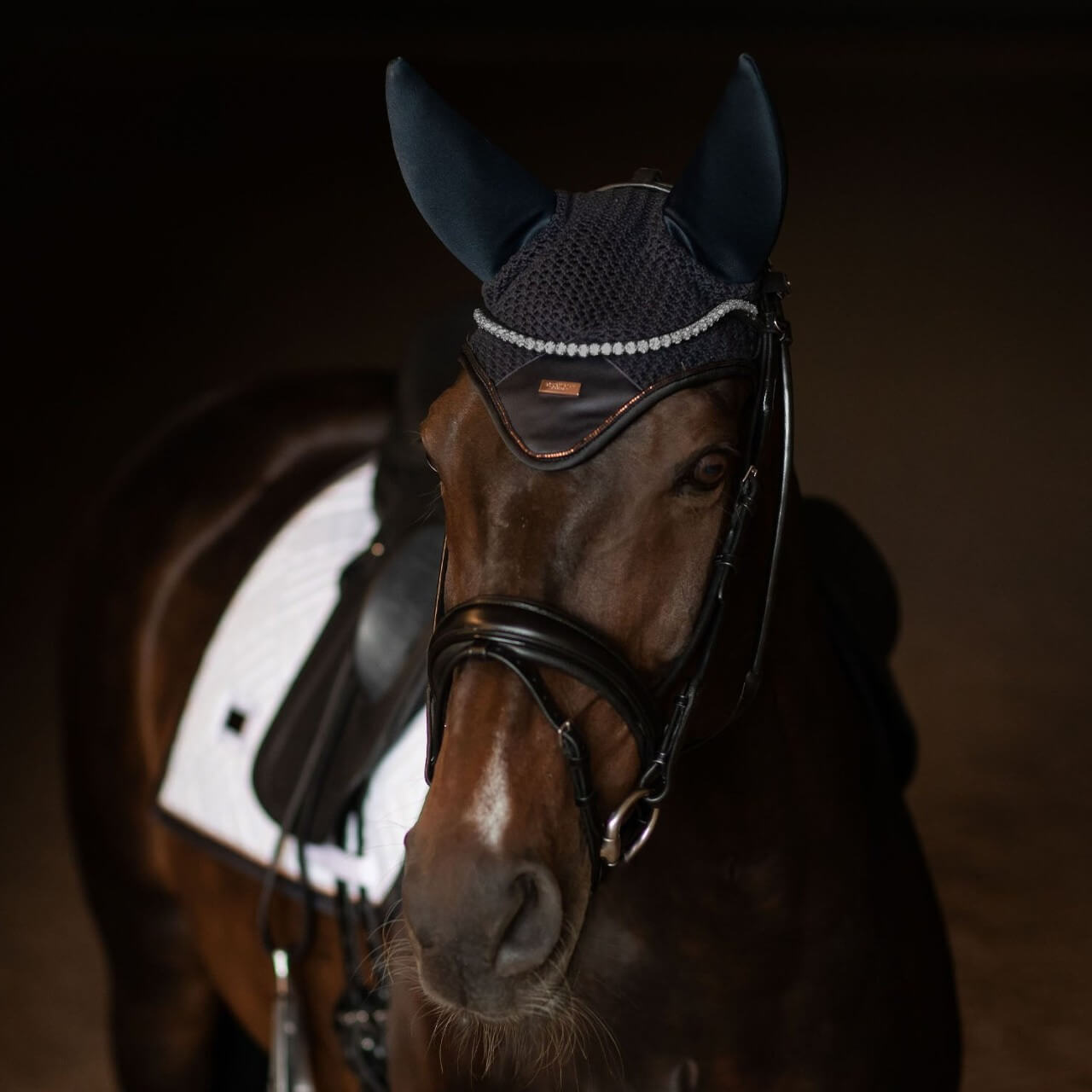 Die Fliegenmütze beeindruckt mit einem tiefen Dark-Ocean-Blau, das deinem Pferd eine majestätische Ausstrahlung verleiht. Das filigrane Satinpatch und die dezente Paspelierung betonen die hochwertige Verarbeitung, während das Roségold-Badge einen edlen Akzent setzt. Dieses Design sorgt nicht nur für Ästhetik, sondern auch für eine perfekte Passform und Komfort.