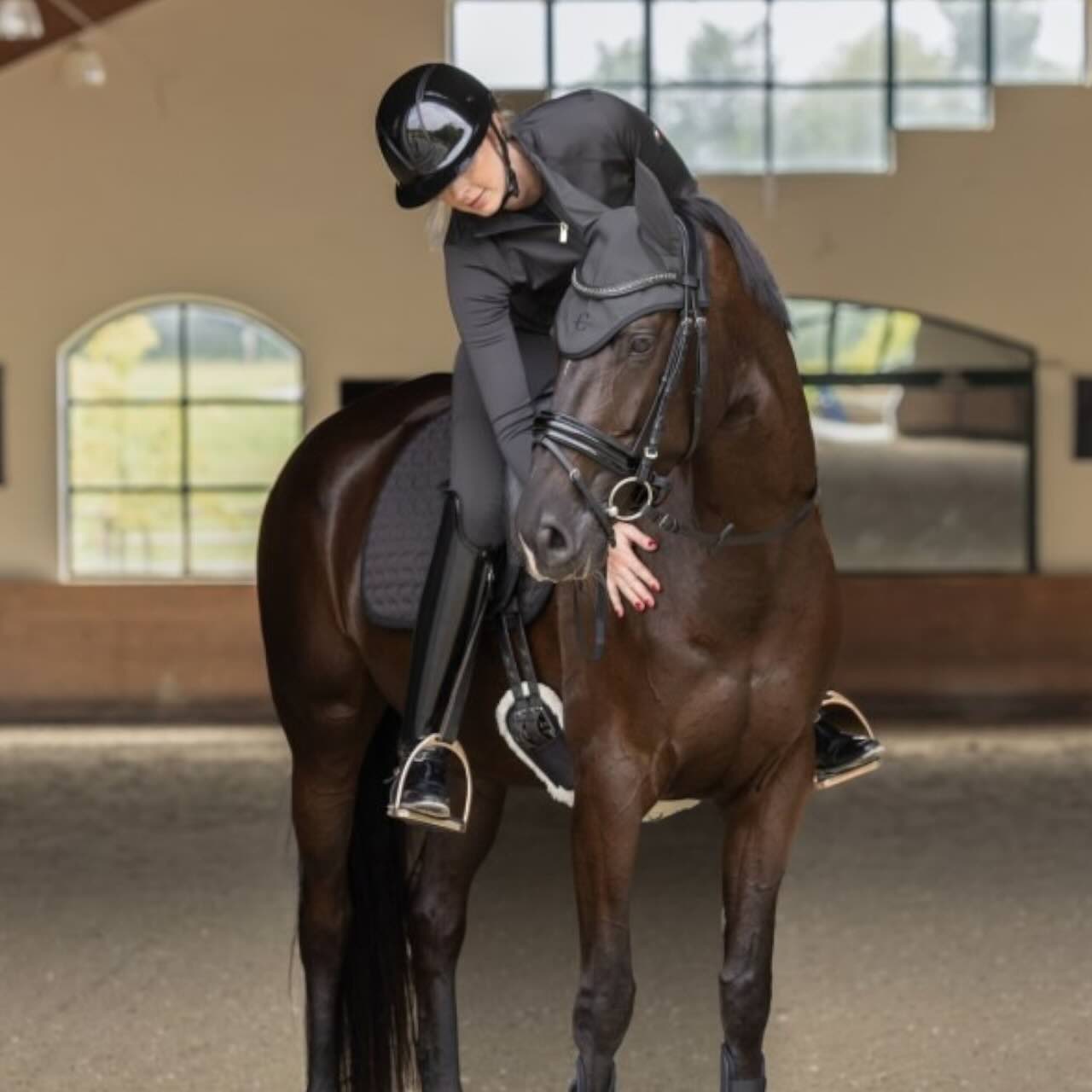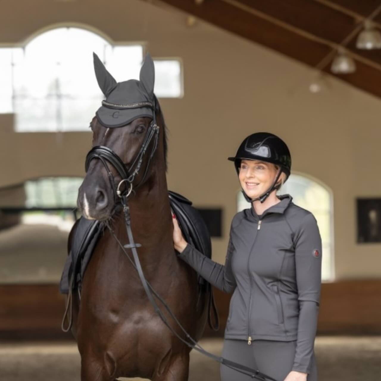 Das edle Design mit schlichtem Logoschriftzug macht die Fliegenhaube zum stilvollen Begleiter auf dem Turnierplatz. Hergestellt aus einer pflegeleichten Materialkombination aus 75 % Spandex und 25 % Polyamid, lässt sich die Mütze ganz einfach bei 30 °C in der Maschine waschen. So bleibt sie dauerhaft hygienisch und einsatzbereit – ideal für Sport- und Freizeitreiter gleichermaßen.
